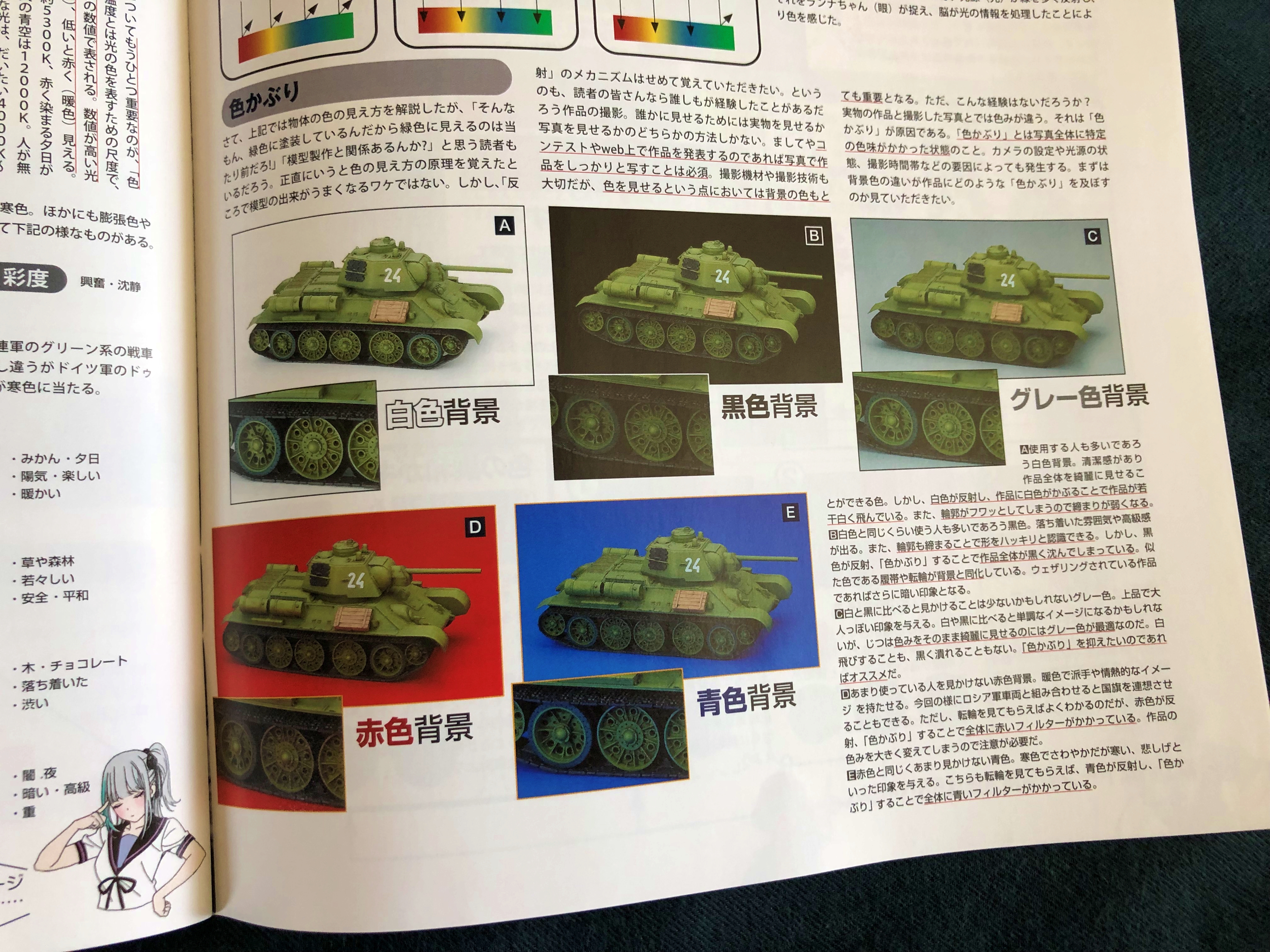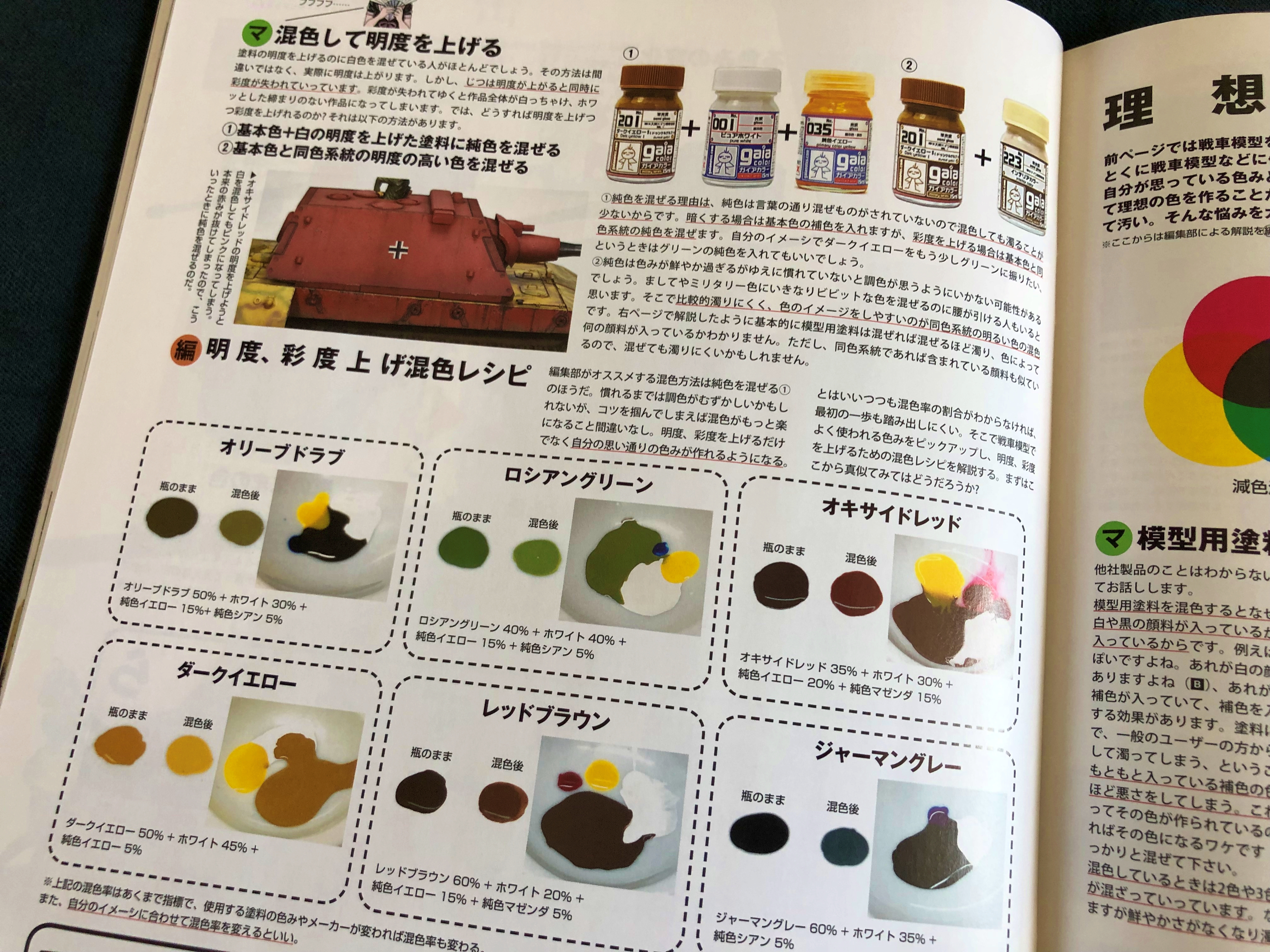 어떠한 관점에서 색을 만드는가.- 에 대해 이번호에서는 원래 색상에 대한 고증보다는 보이는 관점. 즉, 보는 사람을 위한 관점에 있어서 설명하고 있습니다. 현실과 사진의 차이점일까요? 이제까지 보아온 모델러들은 현실에 촛점을 맞추었는데 이 책에서는 현실을 남겨놓은 좋은 사진에 촛점을 두고 있습니다. 역사 교과서보다는 아트에 가까워졌을까요?