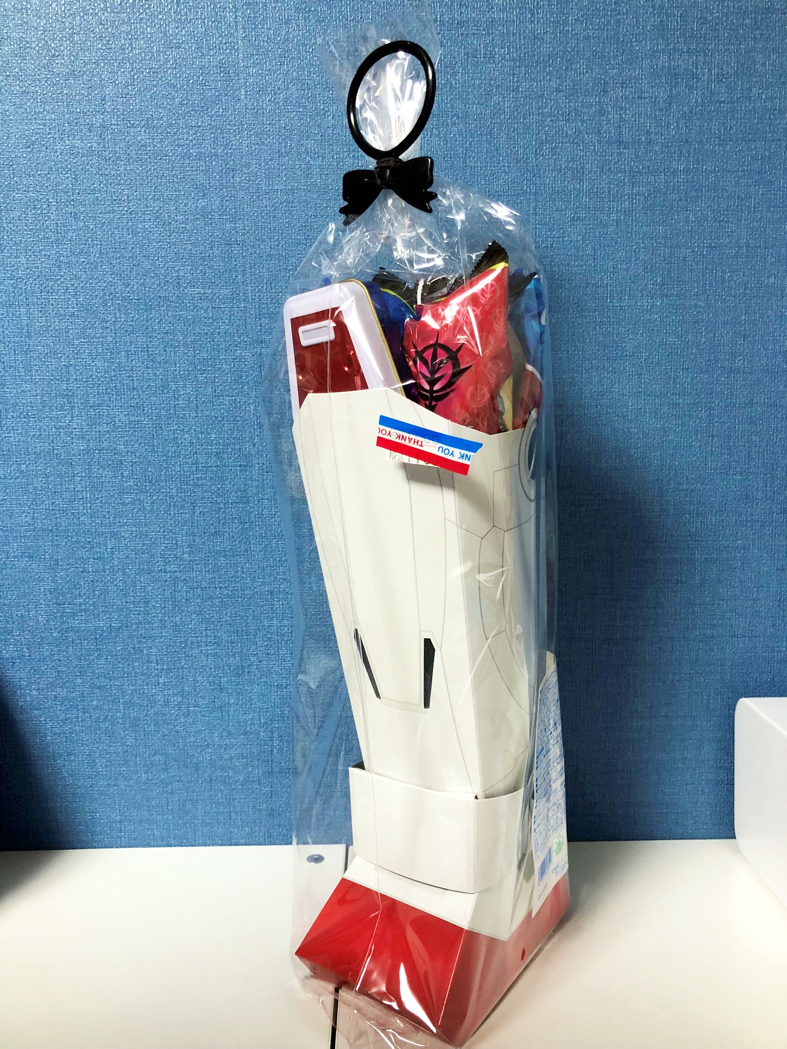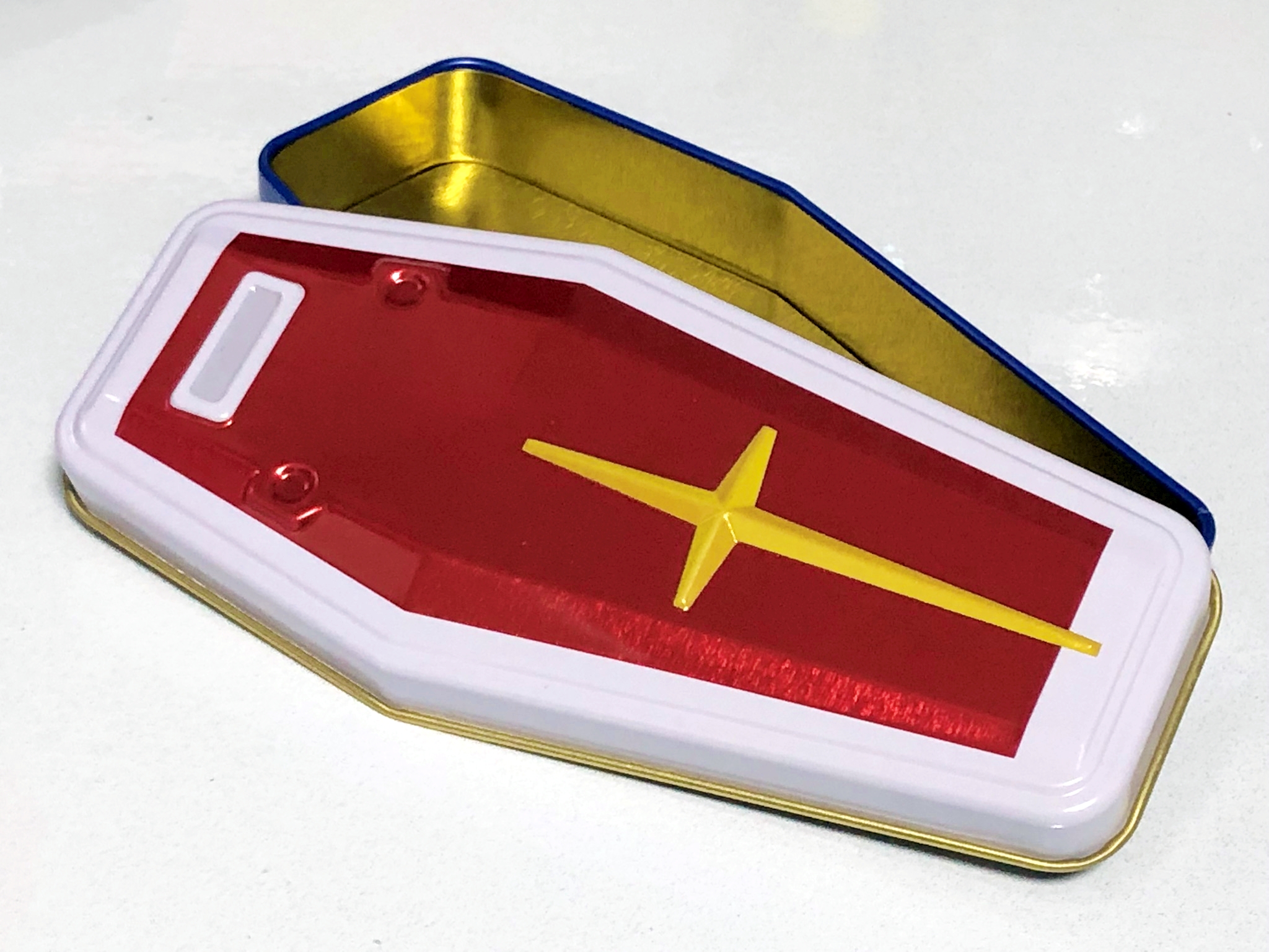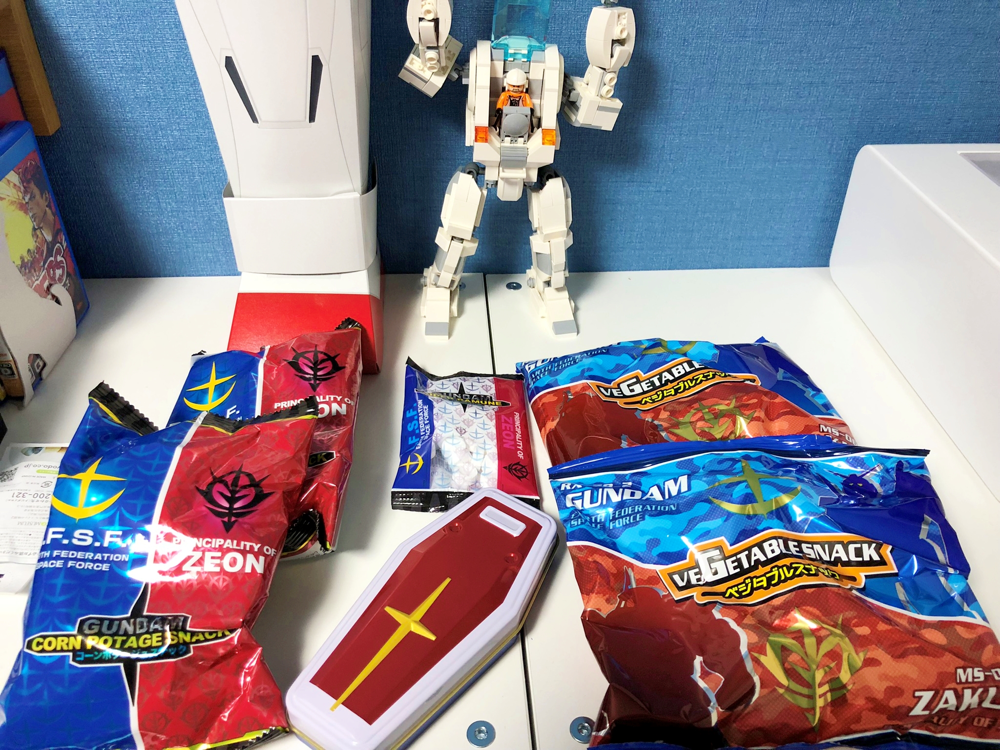 콘 포타쥬 맛 과자가 두봉지, 야채 과자가 두봉지, 라무네가 1봉지, 그리고 대망의 건담 실드형 철 케이스