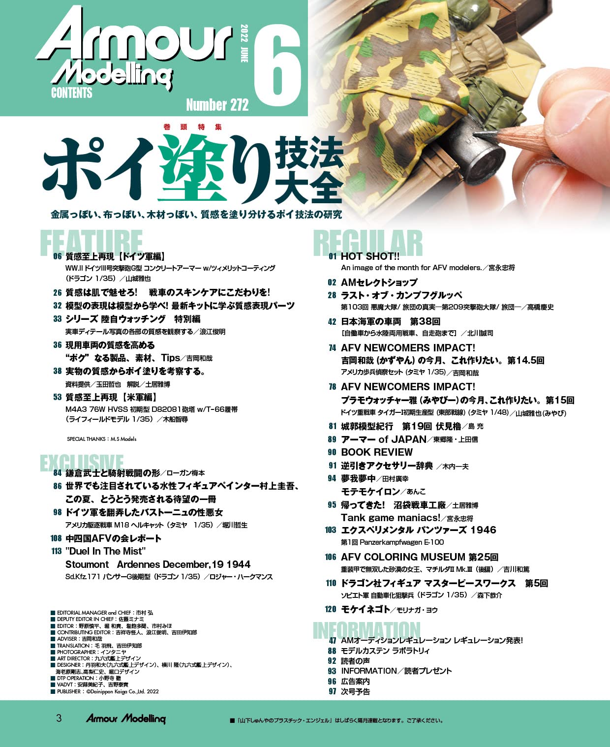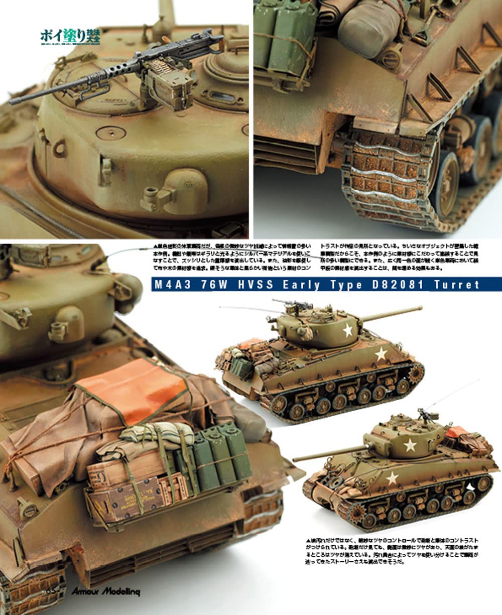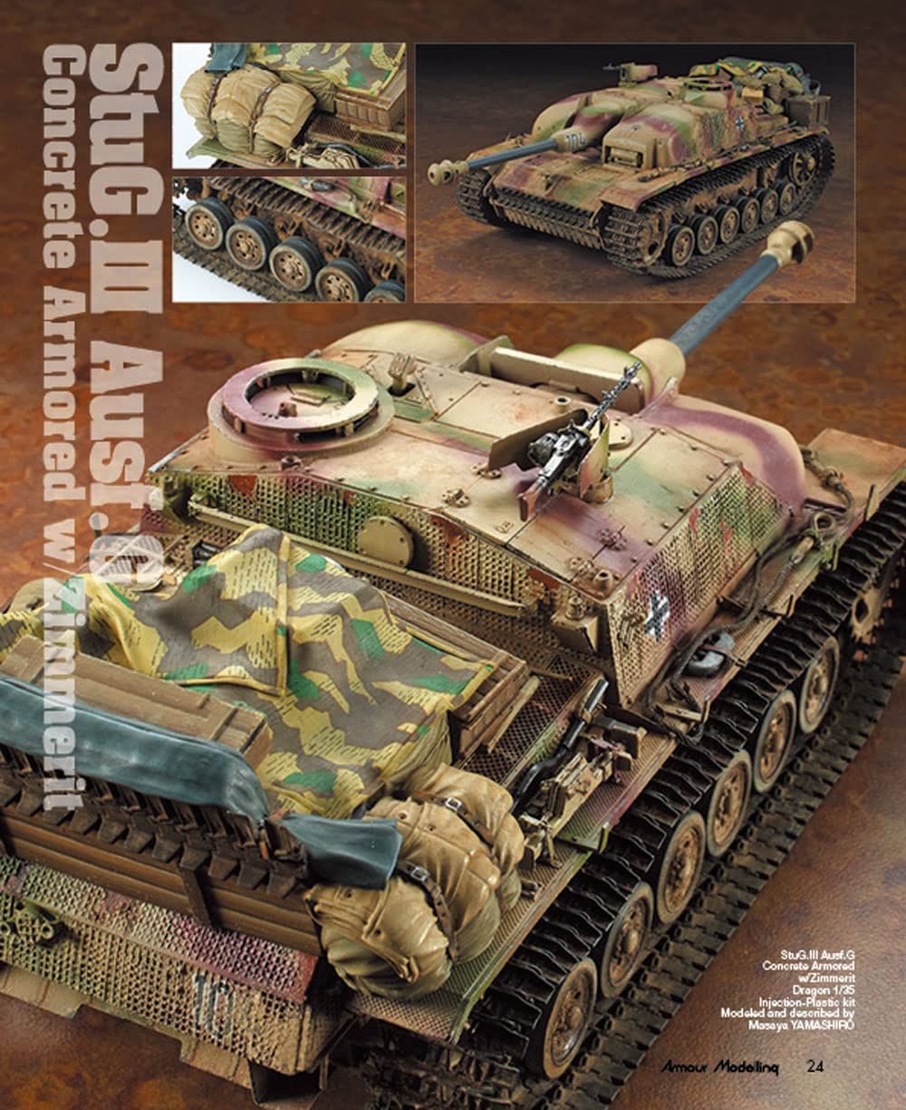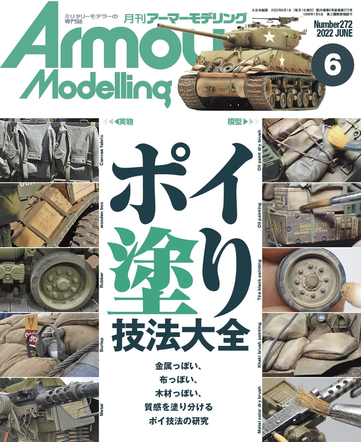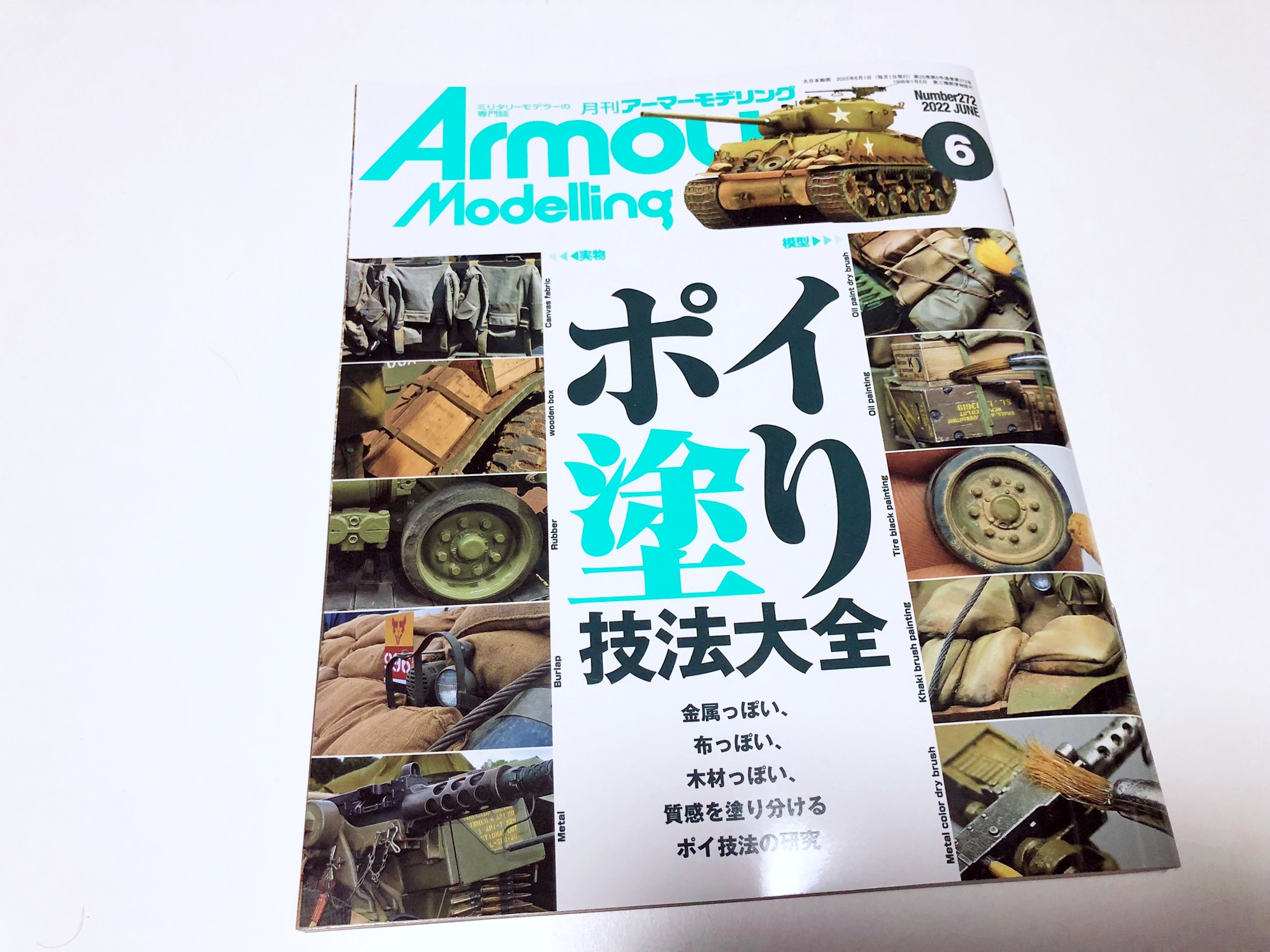 월간 아머 모델링 2022년 6월호는 질감 특집! '포이칠(~처럼 칠하기 혹은 콕콕 칠하기) 기법 대전'이라는 제목으로 전차 모형의 질감을 표현을 보다 자연스럽게 만드는 특집으로 꾸며져 있습니다. 철, 나무, 천 등 다양한 소재로 구성된 전차. 그 전차를 모형으로써 사실적으로 재현하기 위해서는 어떻게 하면 좋을까요. 이번에는 독일군 편, 미군 편 두 가지로 나눠 철저히 기법을 소개. 독일군 편에서는 III호 돌격포, 미군 편에서는 셔먼 전차를 소재로 짐이나 콘크리트 아머 등의 리얼한 질감을 재현하는 초절모델러의 기술을 보여줍니다. 당시의 사진으로는 알기 어려운 OVM등의 소재를 귀중한 실물의 사진을 섞어서 해설. 하나하나의 장비품을 컬러로 볼 수 있는 자료로써도 일품입니다. 특집 이외에도 최신 키트를 사용한 다이오라마 작례나, 해외 모델러의 신작도 소개. 이번달도 푸짐한 한권이 되어있어요!