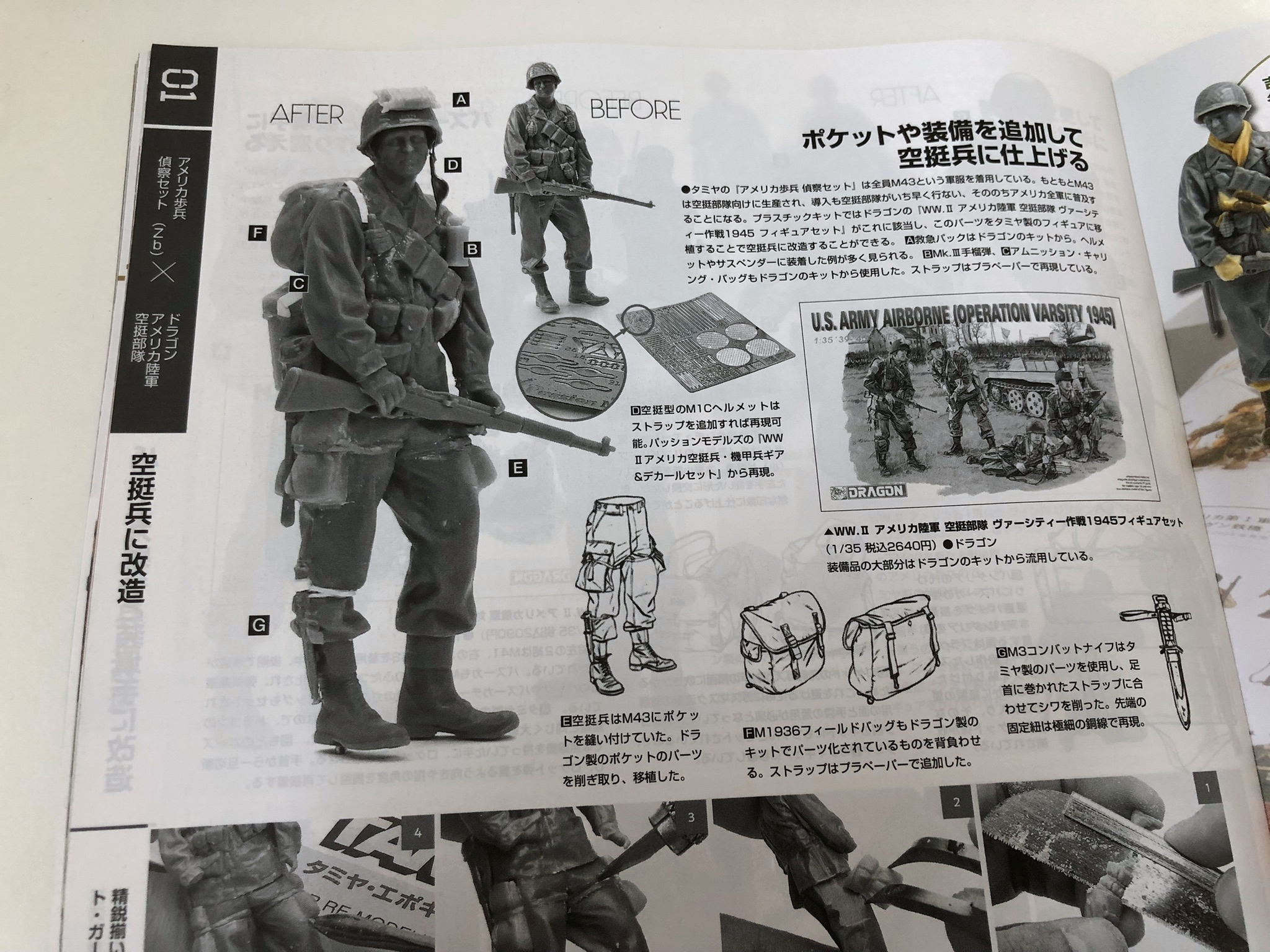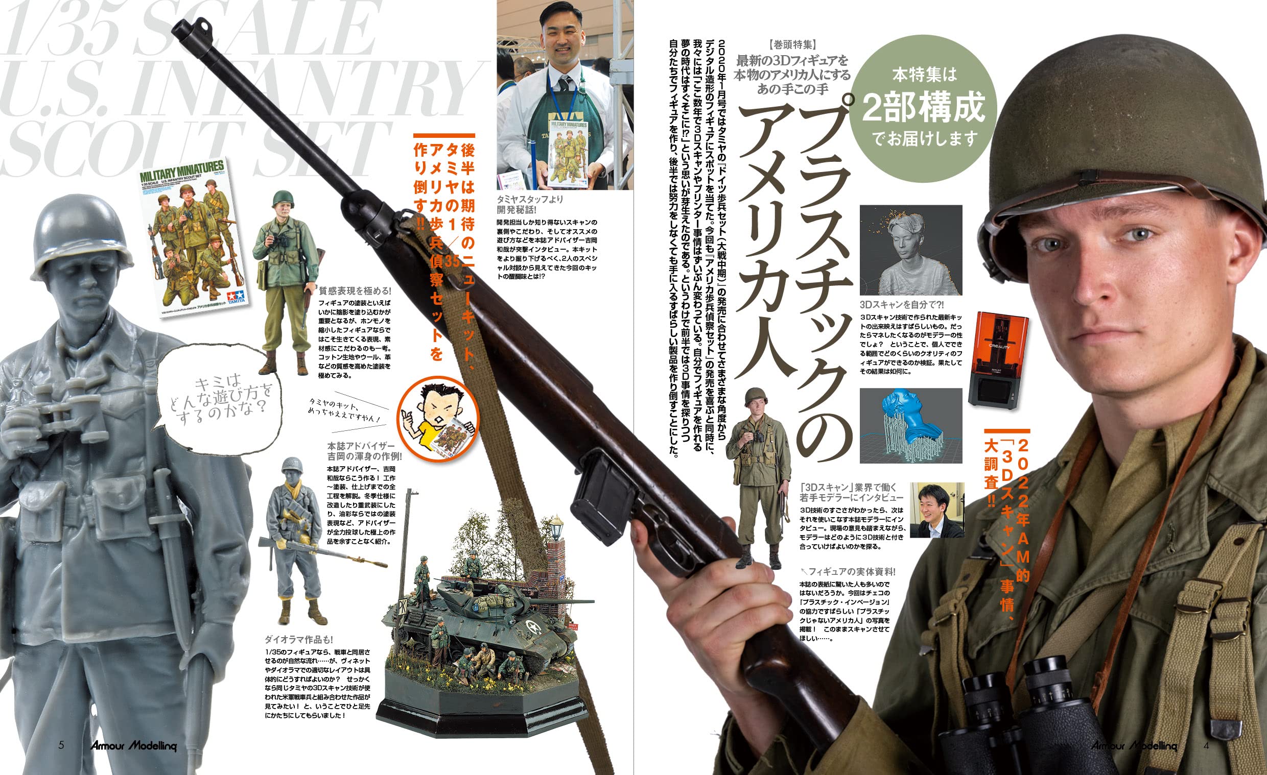 타미야에서 발매된 3D 스캔 기술로 만들어진 미국 보병 정찰 세트를 날려버리는 이번 특집. 다양한 접근법에 의한 도장 작례나 개조의 힌트도 소개. 미군을 좋아하는 AM지 어드바이저 요시오카 카즈야도 최신작을 내걸고 참전. 오직 AM지에서만 읽을 수 있는 개발 비화도 풍성하게 게재. 체코에서 활동하는 단체들의 협조를 받아 미군 피겨를 실사화하는 데 성공. 나아가 자작 3D 스캔 피겨는 개인 차원에서 어디까지 할 수 있는지 모색. 실제 출력된 것을 비교하면서 3D 기술의 실상을 알려드립니다. 미군 피겨 자료로 참고서로 영구 보존판 특집입니다.