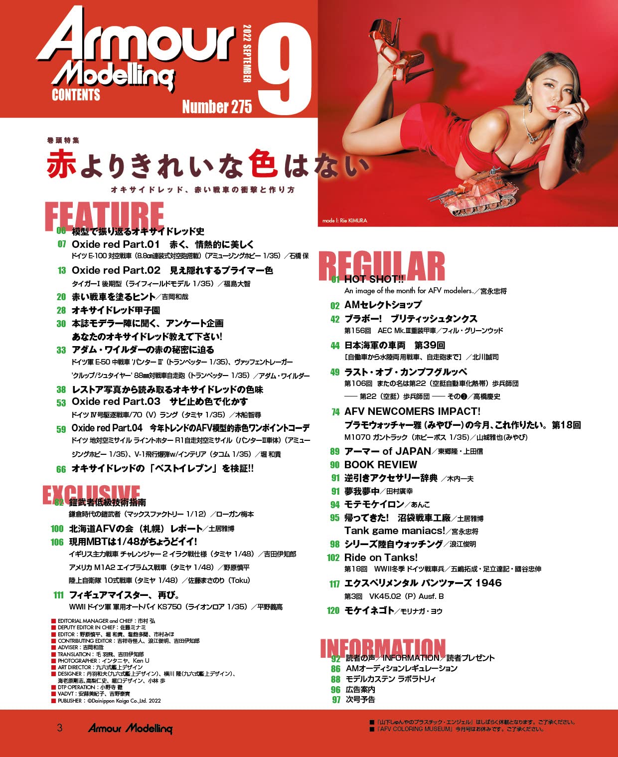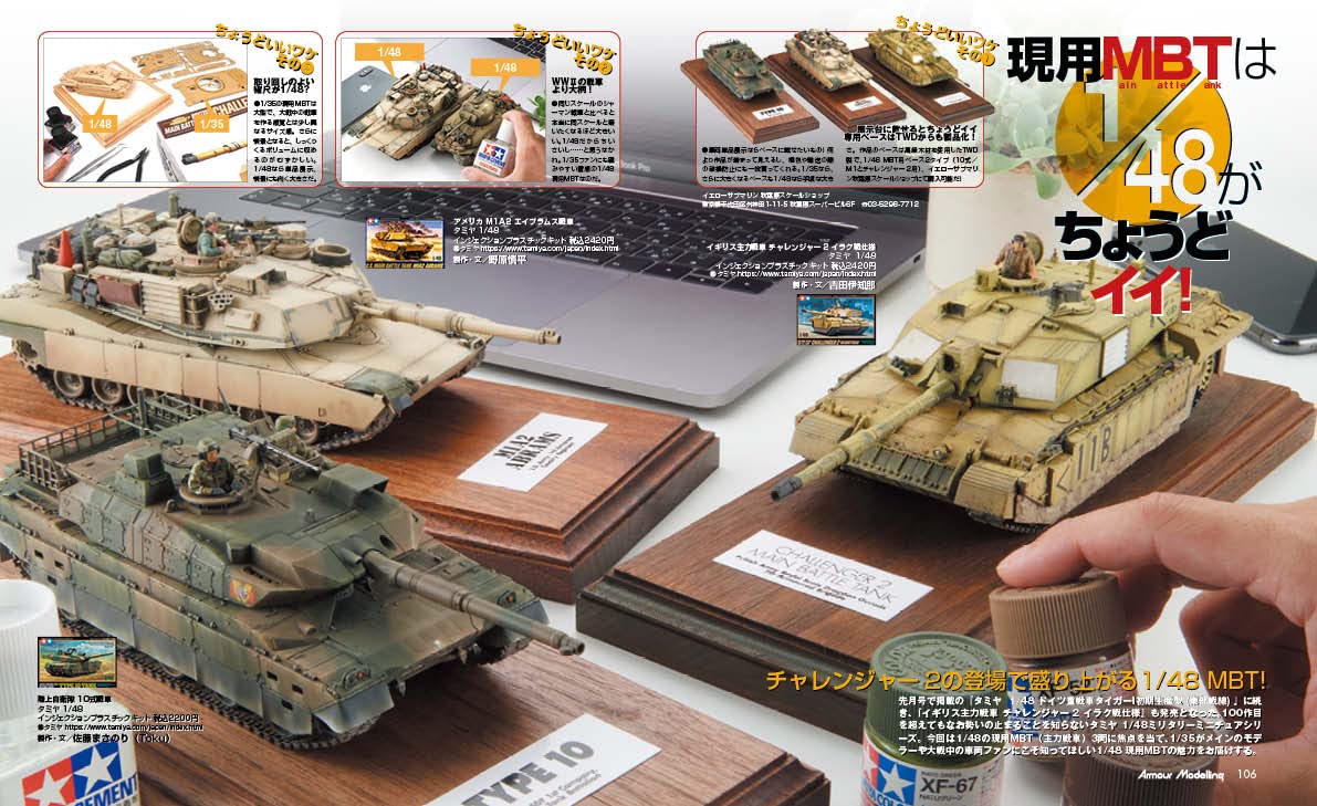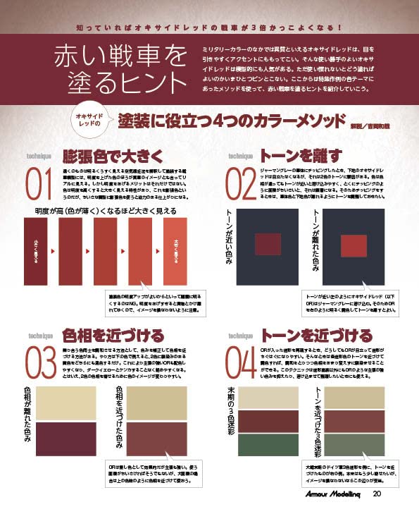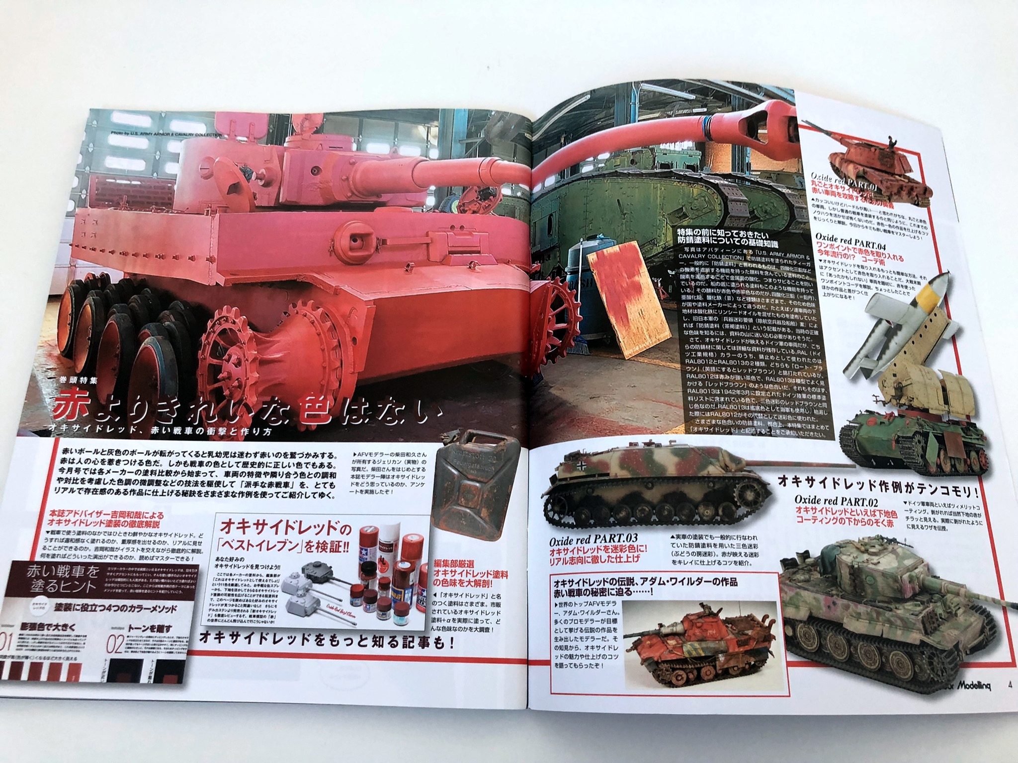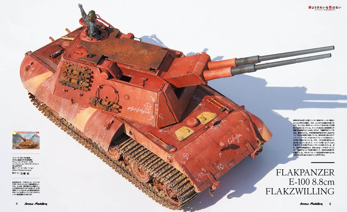 이번 달 월간 아머 모델링은 '옥사이드 레드' 특집! 색감과 피탄, 수리 흔적, 말기감 등의 연출로 맹활약하는 옥사이드 레드. 어떻게 하면 효과적으로 소화할 수 있을지, 상황별 공략법을 해설합니다. 차량 전체가 붉은 차량, 원 포인트 악센트로 붉은 차량, 그리고 옥사이드 레드를 도입한 삼색 미채 등 본지 모델러 진의 작례를 소개는 물론, 사진 자료도 충실합니다. 전설의 모델러, 아담 와일더씨의 옥사이드 레드에 관한 해설이나, 모델러와의 인터뷰도 게재. SNS나 전시회에서 눈에 띄는 「붉은」차량의 공략에 빠뜨릴 수 없는 특집이 되고 있습니다. 또, 후반에는 타미야 1/48M의 챌린저 2를 비롯한 현용 차량의 작례를, 3종으로 정리하여 게재. 그리고 피규어 마이스터, 히라노 요시타카씨의 신규 작례도 게재. 이번 달에도 푸짐한 한 권이 되어 있습니다.