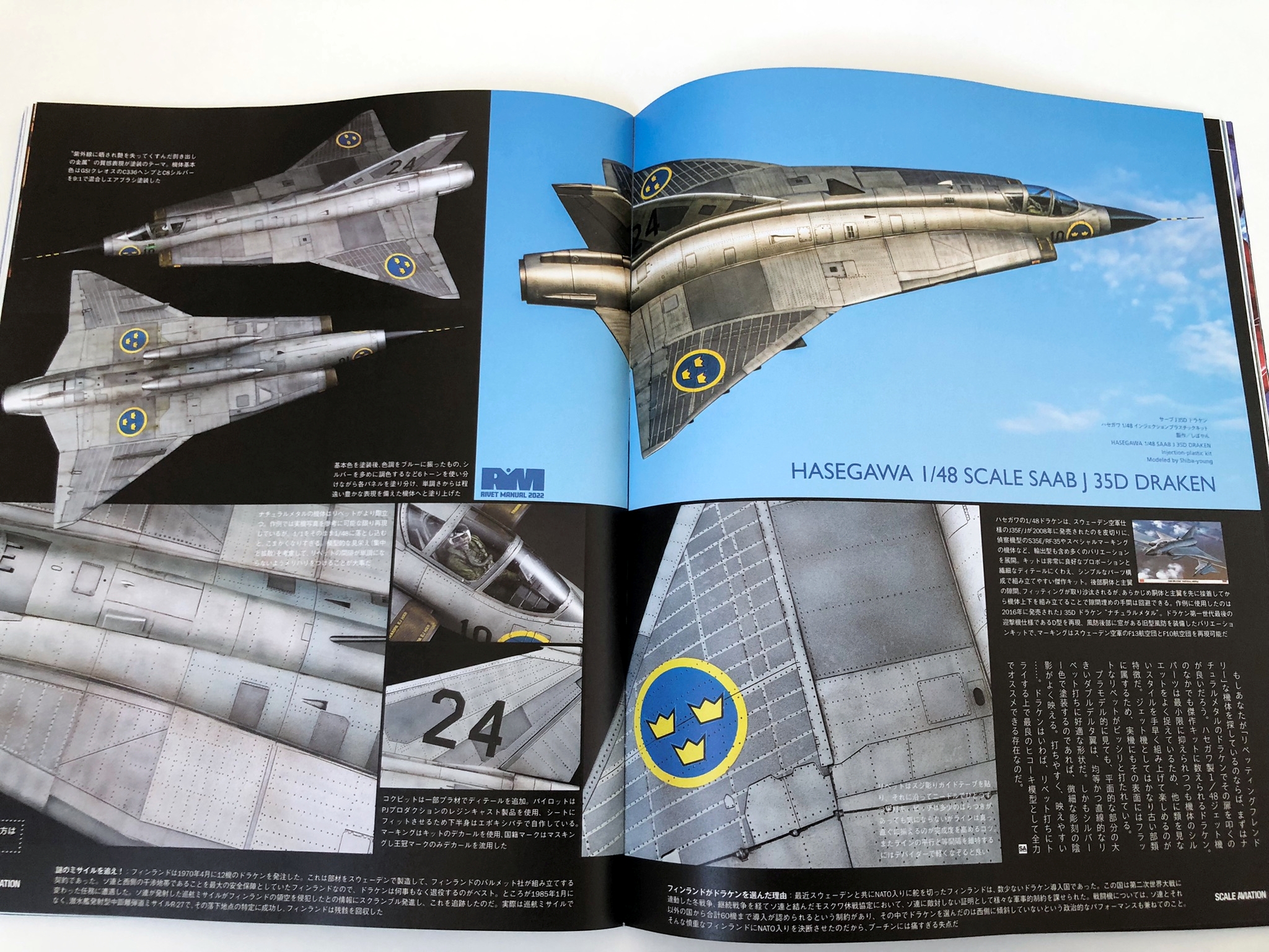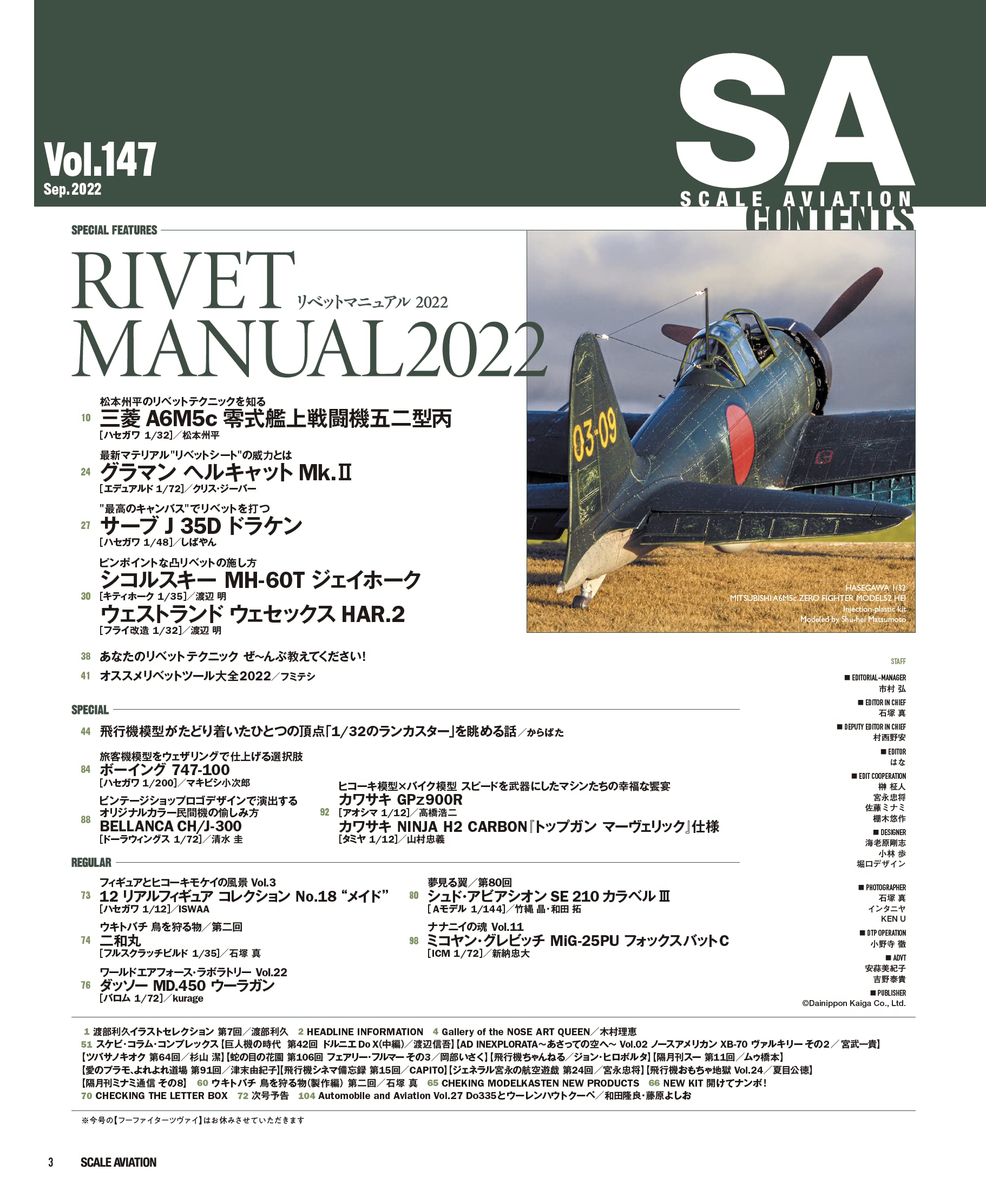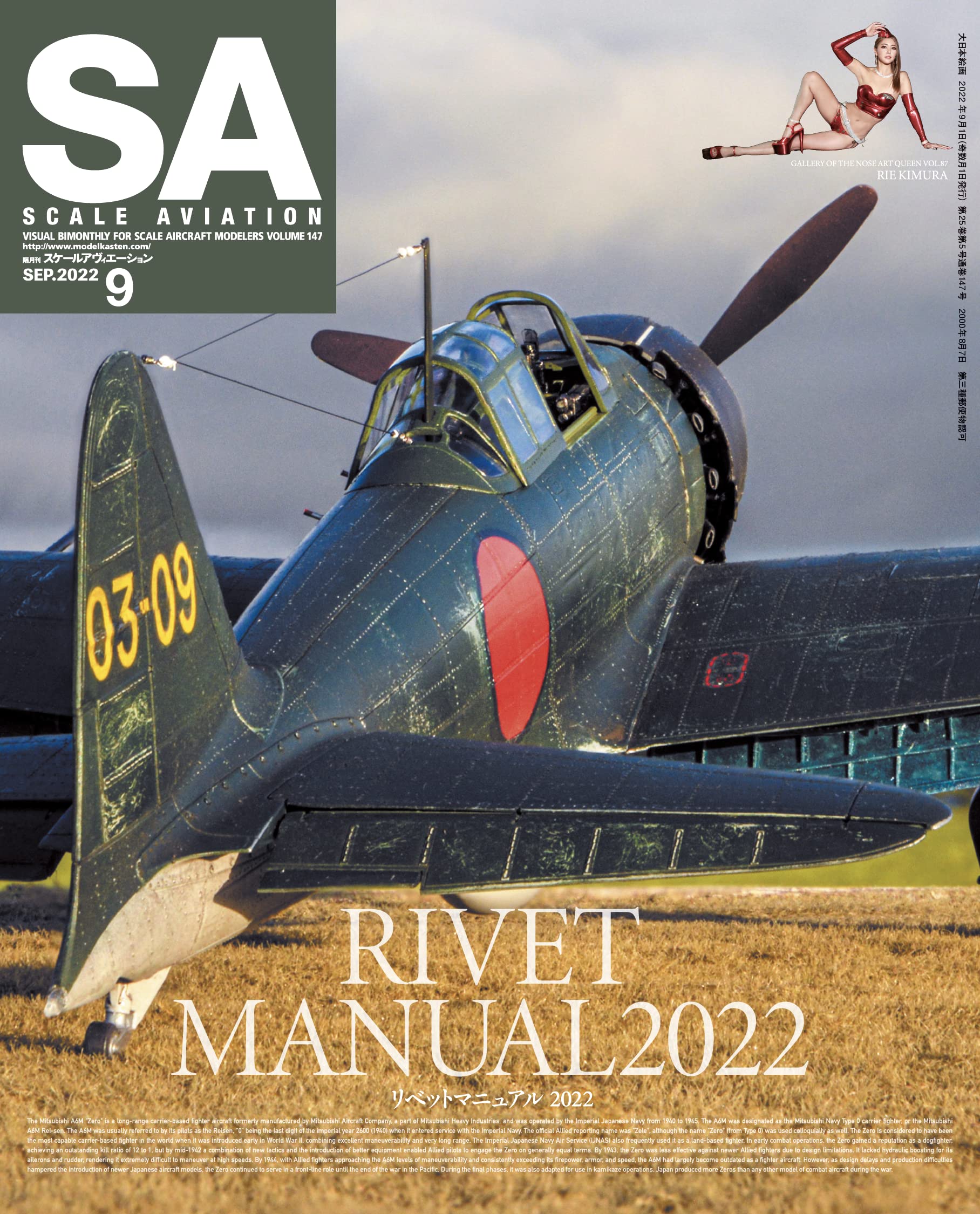 비행기 모형의 완성도를 한층 높여, 보다 리얼리티 있는 마무리를 가능하게 하는「리벳」. 그러나, 실물과 같은 수천개의 작은 압정을 재현하는 디테일 업은 서투른 모델러로써는 귀찮음을 호소하는 일이 많은 것이 사실. 이번호에서는 리벳팅에 자신 있는 프로 모델러들의 리벳 표현술을 일거 소개! 본지에 친숙한 마츠모토 슈헤이님의 1/32 레이시키 52형(영전이라고 쓸까 하다가 발음대로 레이시키로 적습니다.)의 리벳 철저 하우투를 필두로 그 밖의 리벳이 넘치는 비행기와 헬리콥터가 총출동. 읽으면 리벳 표현을 알 수 있다. 그리고 즐거워진다. 이것이야말로 '리벳 매뉴얼 2022'! 이외에도 인기 연재중인 '72의 영혼'에서는 그동안 잘 손대지 않았던 소련기 MiG-25에 도전, 아직 흥분이 식지 않은 '탑건 매버릭'에서 튀어나온 듯한 오토바이 작례, 그 제품화 만으로도 모형계에 큰 충격을 준 보더 모델 1/32 랭커스터의 매력을 이야기하는 등 이번 호도 놓칠 수 없는 한 권으로 완성됐습니다. 노즈 아트 퀸에는 레이스 퀸으로 맹활약 중인 키무라 리에 양이 두번째 등장. 메탈릭한 빨강이 번들거리는 요염한 샷에 눈을 뗄 수 없어요!