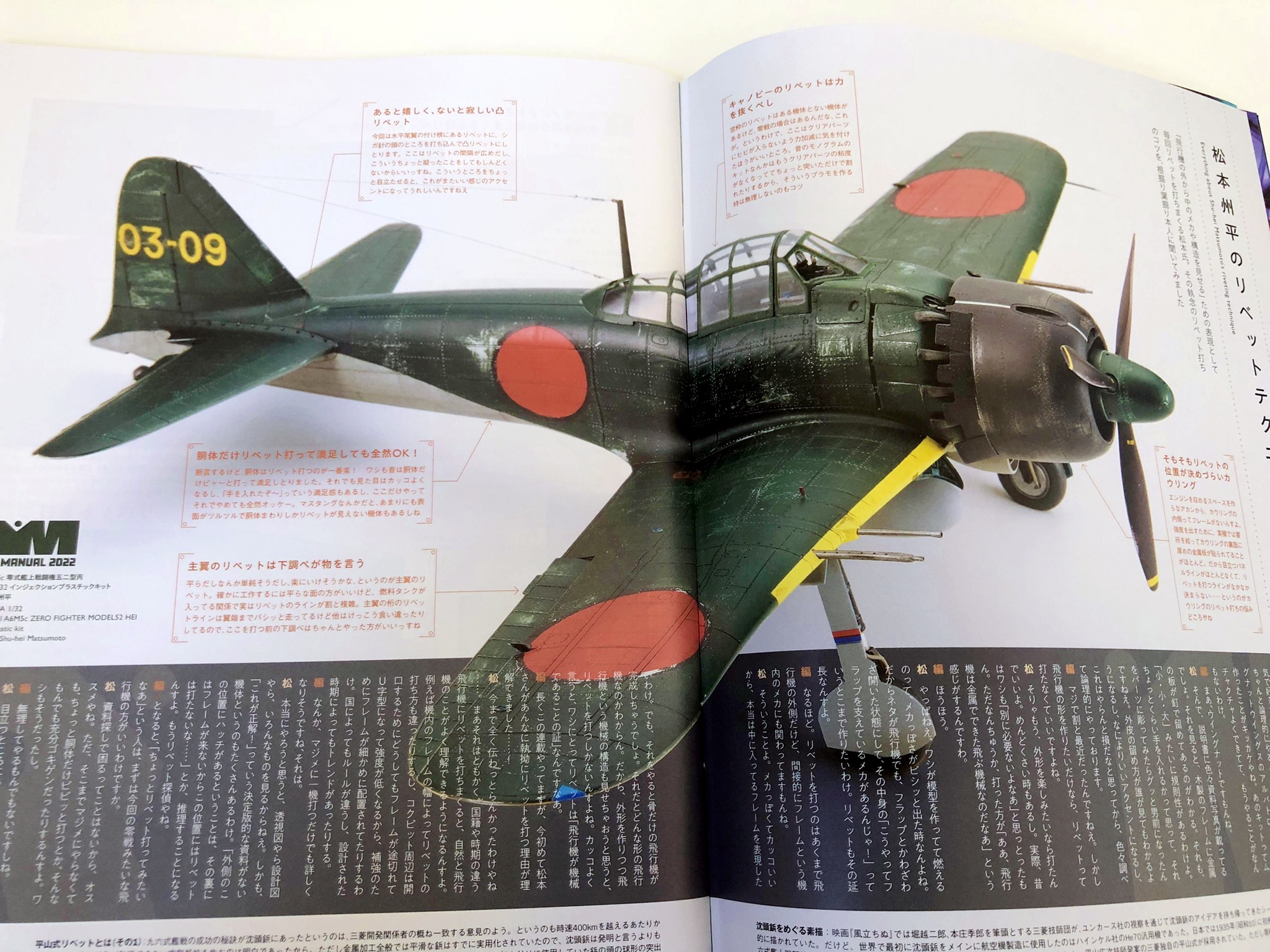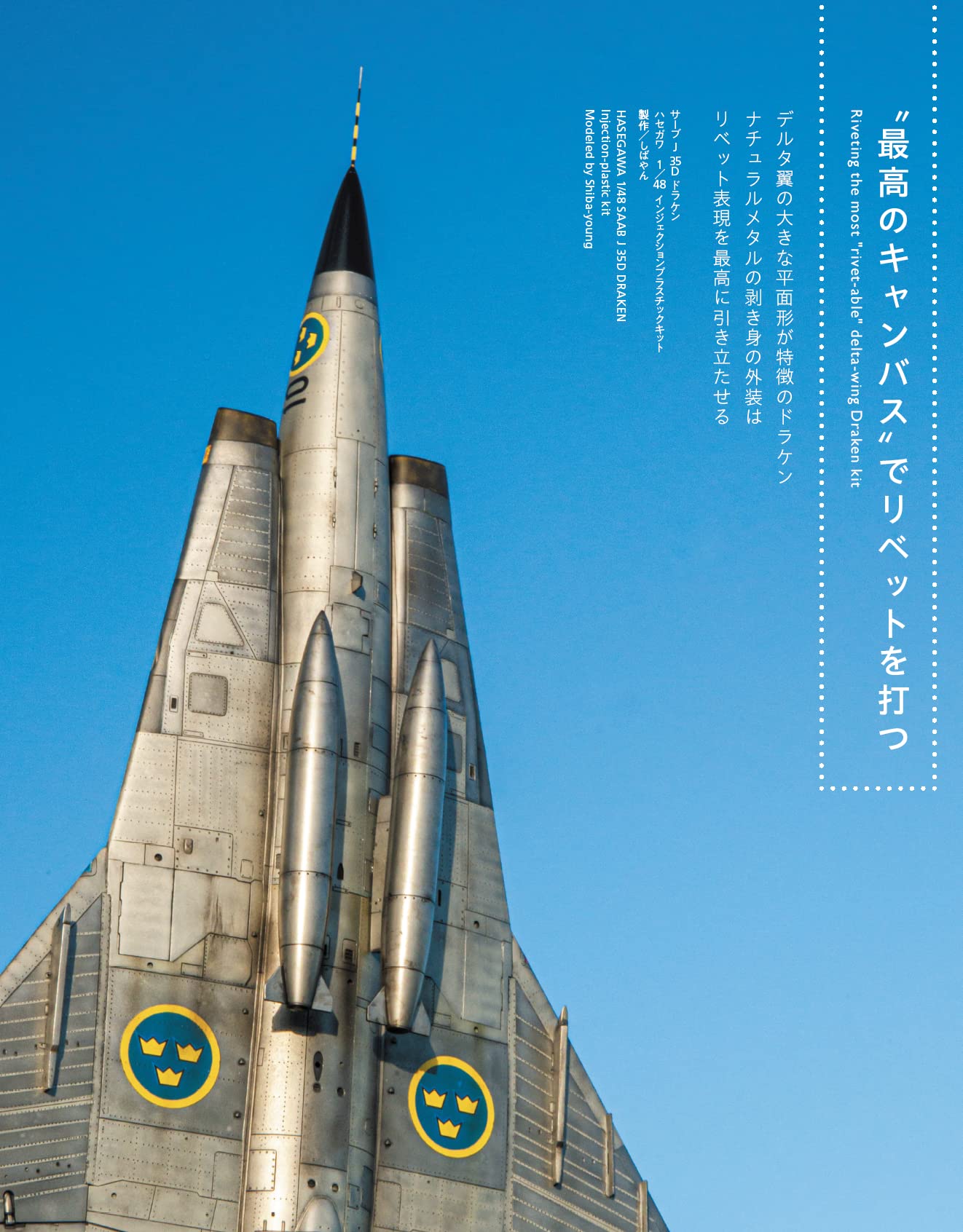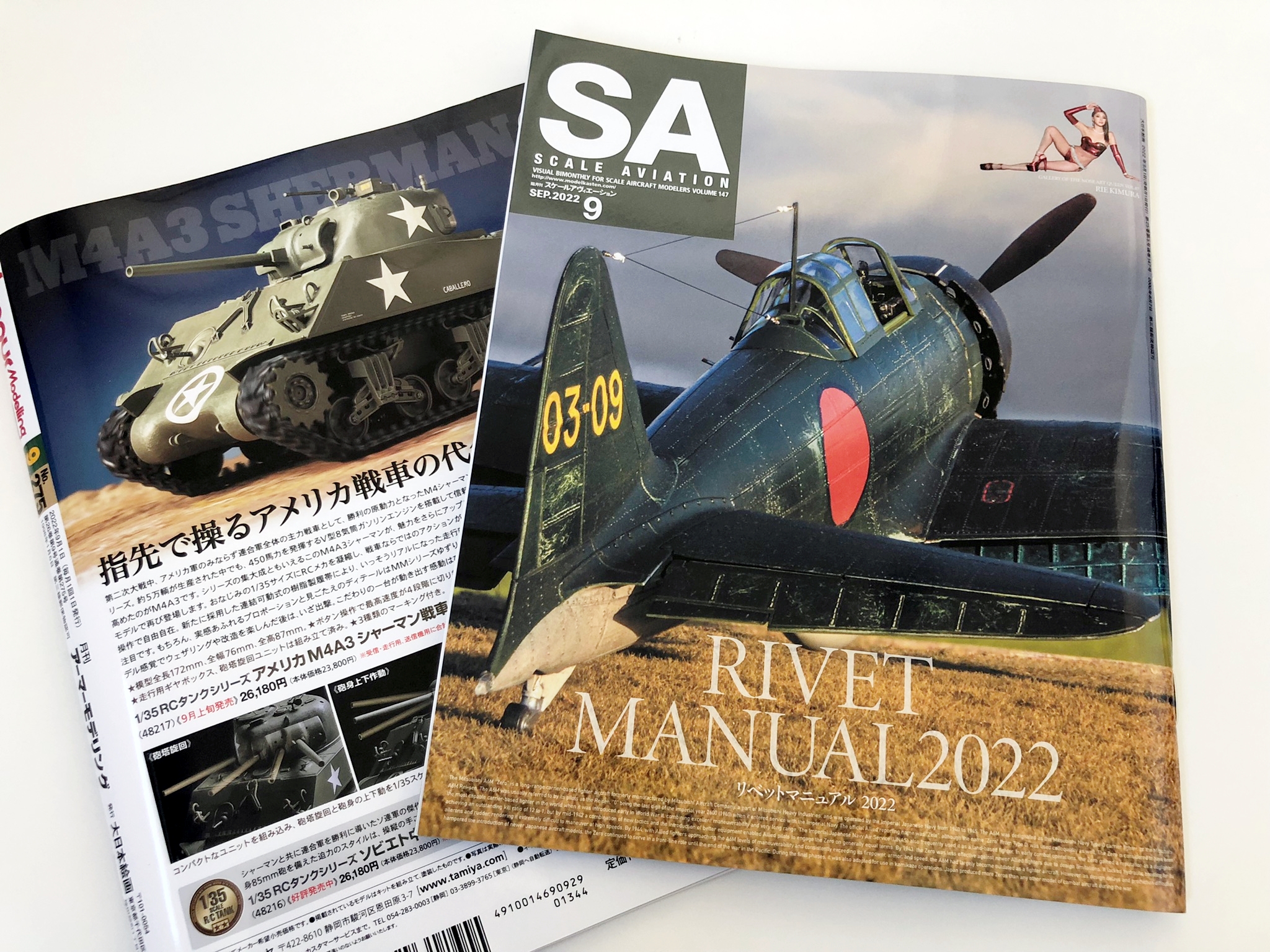 비행기 모형의 완성도를 한층 높여, 보다 리얼리티 있는 마무리를 가능하게 하는「리벳」. 그러나, 실물과 같은 수천개의 작은 압정을 재현하는 디테일 업은 서투른 모델러로써는 귀찮음을 호소하는 일이 많은 것이 사실. 이번호에서는 리벳팅에 자신 있는 프로 모델러들의 리벳 표현술을 일거 소개! 본지에 친숙한 마츠모토 슈헤이님의 1/32 레이시키 52형(영전이라고 쓸까 하다가 발음대로 레이시키로 적습니다.)의 리벳 철저 하우투를 필두로 그 밖의 리벳이 넘치는 비행기와 헬리콥터가 총출동. 읽으면 리벳 표현을 알 수 있다. 그리고 즐거워진다. 이것이야말로 '리벳 매뉴얼 2022'! 이외에도 인기 연재중인 '72의 영혼'에서는 그동안 잘 손대지 않았던 소련기 MiG-25에 도전, 아직 흥분이 식지 않은 '탑건 매버릭'에서 튀어나온 듯한 오토바이 작례, 그 제품화 만으로도 모형계에 큰 충격을 준 보더 모델 1/32 랭커스터의 매력을 이야기하는 등 이번 호도 놓칠 수 없는 한 권으로 완성됐습니다. 노즈 아트 퀸에는 레이스 퀸으로 맹활약 중인 키무라 리에 양이 두번째 등장. 메탈릭한 빨강이 번들거리는 요염한 샷에 눈을 뗄 수 없어요!
