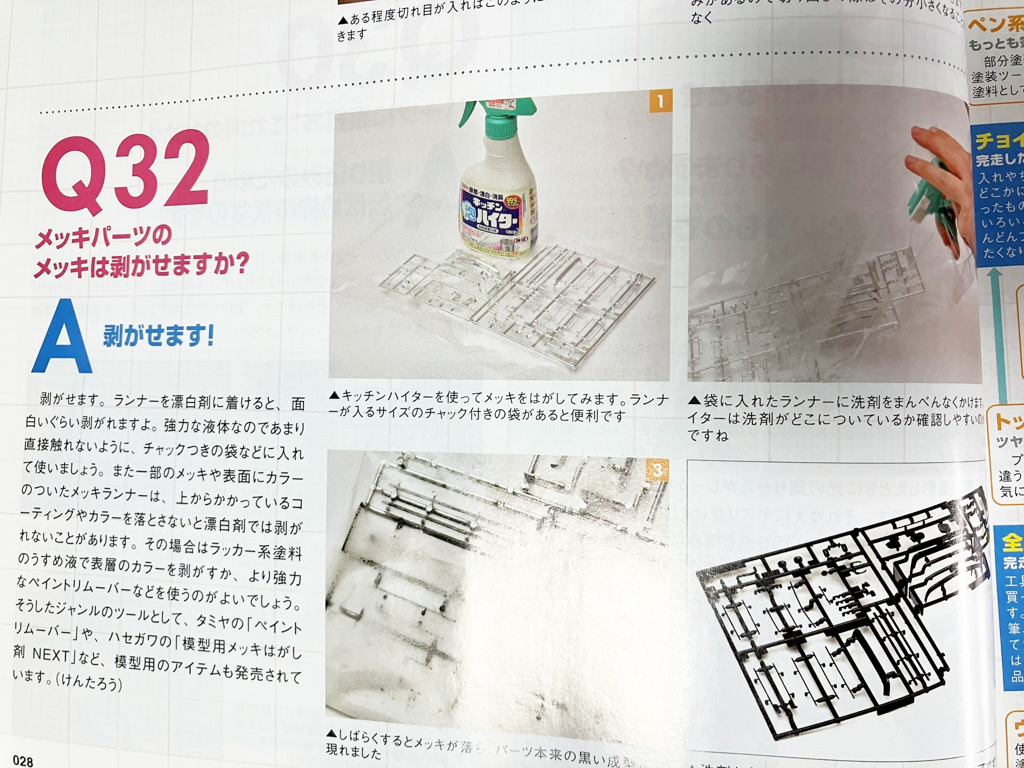 보통 멕기 파츠를 벗겨낼 때는 신너탕이 당연한 것으로 생각하고 있었는데, 주방용 살균 세제인 키친 아와 하이타가 프라스틱에 자극없이 깨끗이 벗져진다는 점은 처음 알았습니다. 한국에서는 대체품으로 분우기 형태로 된 유한락스 주방청소용을 쓰시면 됩니다.
