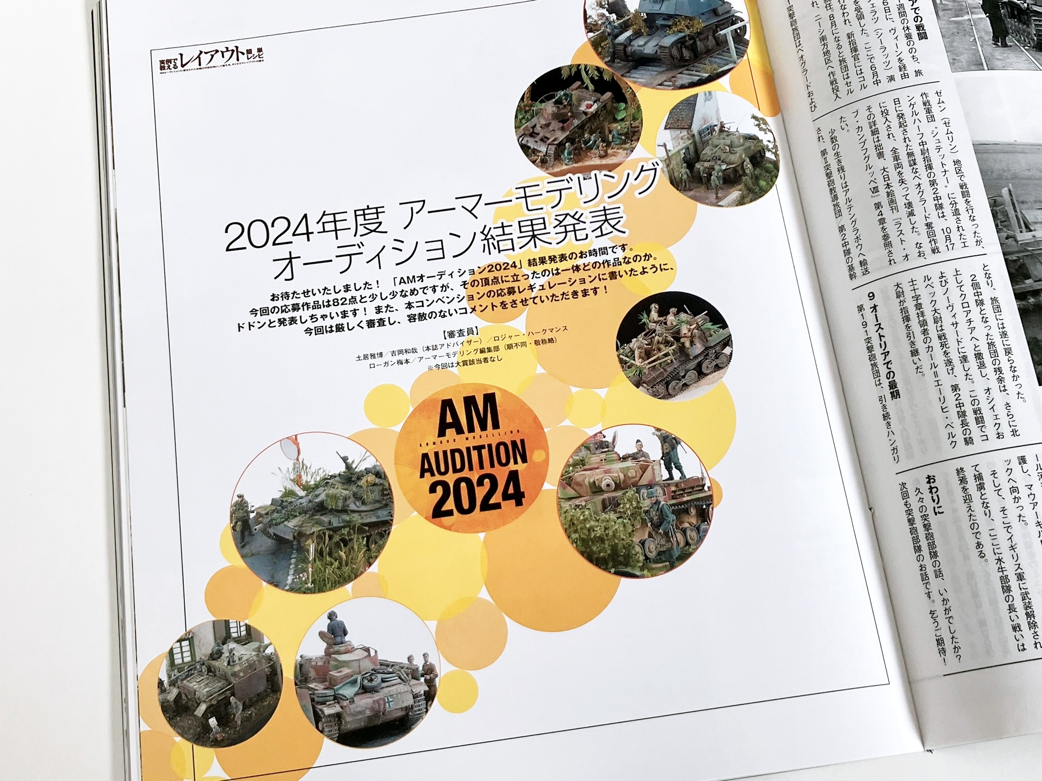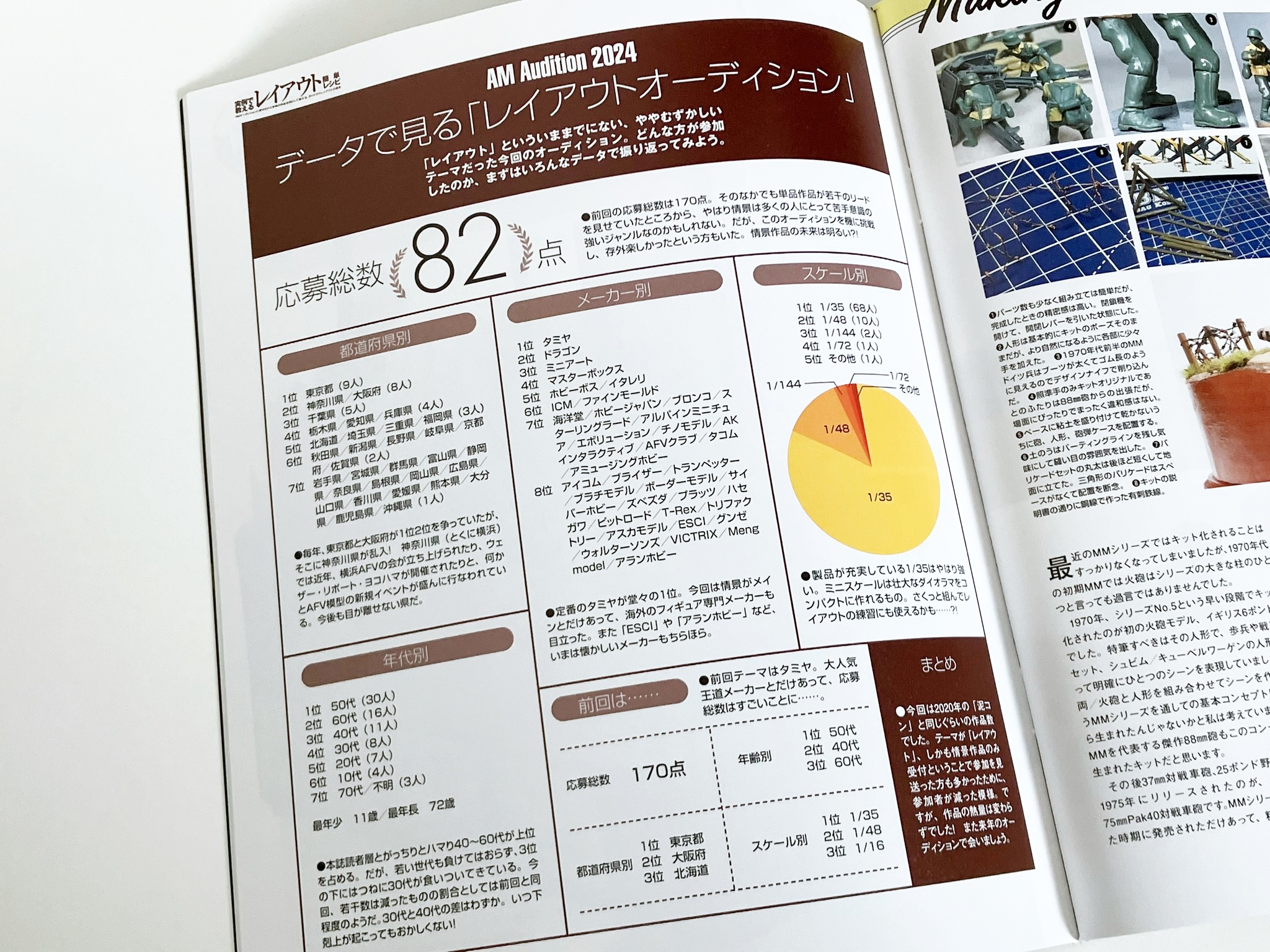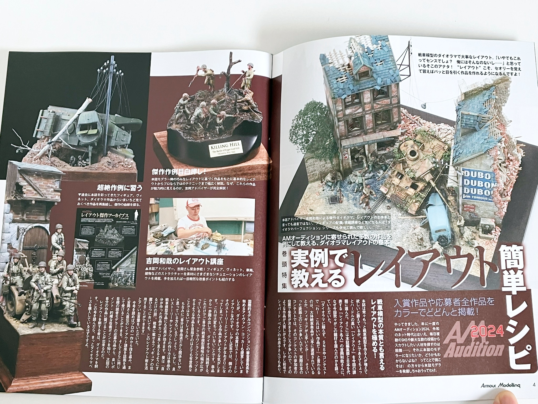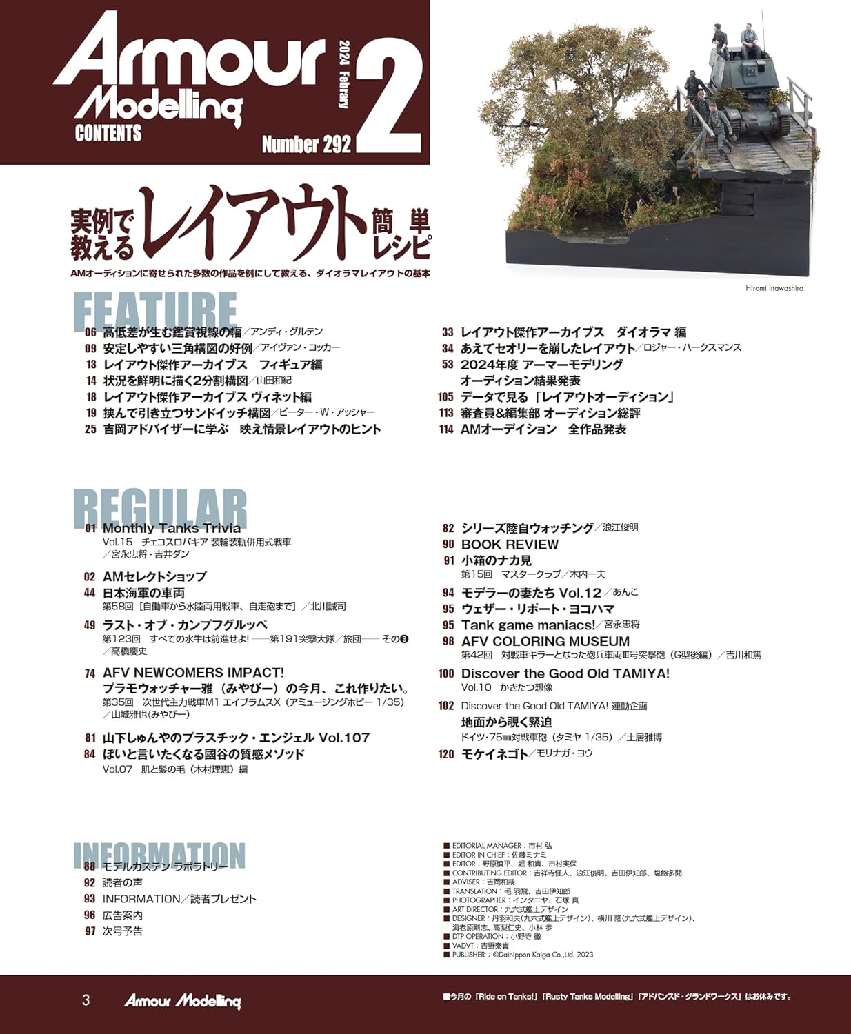 권두 특집 '실례로 알려주는 레이아웃 간단 레시피'. 일본을 대표하는 레이아웃의 명인, 요시오카 카즈야님에게 레이아웃의 중요성을 차분히 배우자! 우선은 프로의 모델과 요시오카 씨의 상세한 해설을 보면서 능숙한 레이아웃은 무엇인지 제대로 배운다. 배우면 실천하는 것으로, 레이아웃 강좌를 급히 개최. 편집부원들이 여러가지 상황의 레이아웃을 만들어, 그것을 요시오카씨에게 첨삭시킨다. 피규어, 스트럭처를 조금만 움직이는 것만으로, 확 분위기가 바뀌는 모습을 보면 레이아웃의 중요성을 이해할 수 있을 것입니다. 또 AM 오디션 2024 결과 발표도 게재.80개가 넘는 응모 작품을 일거에 공개!