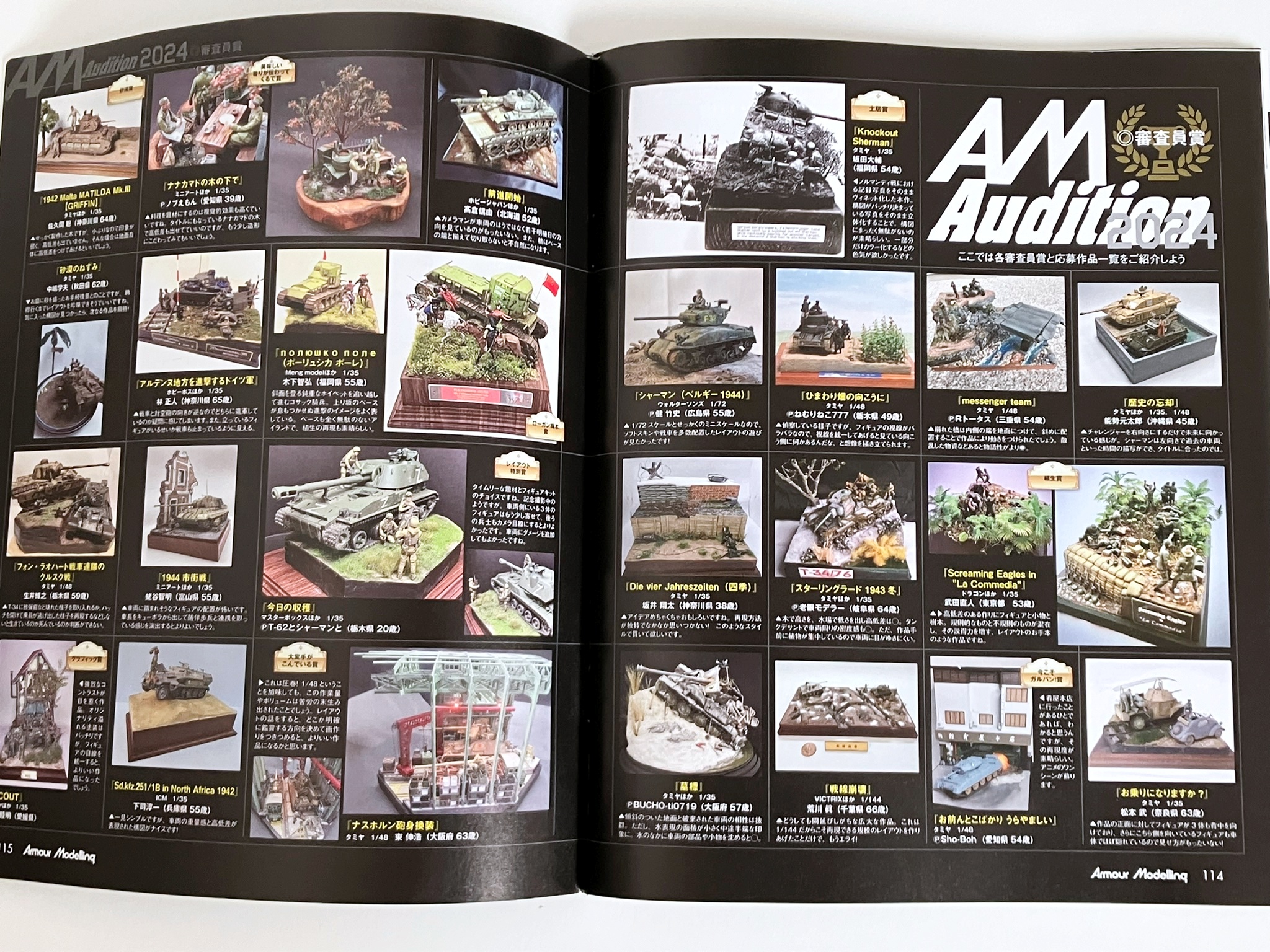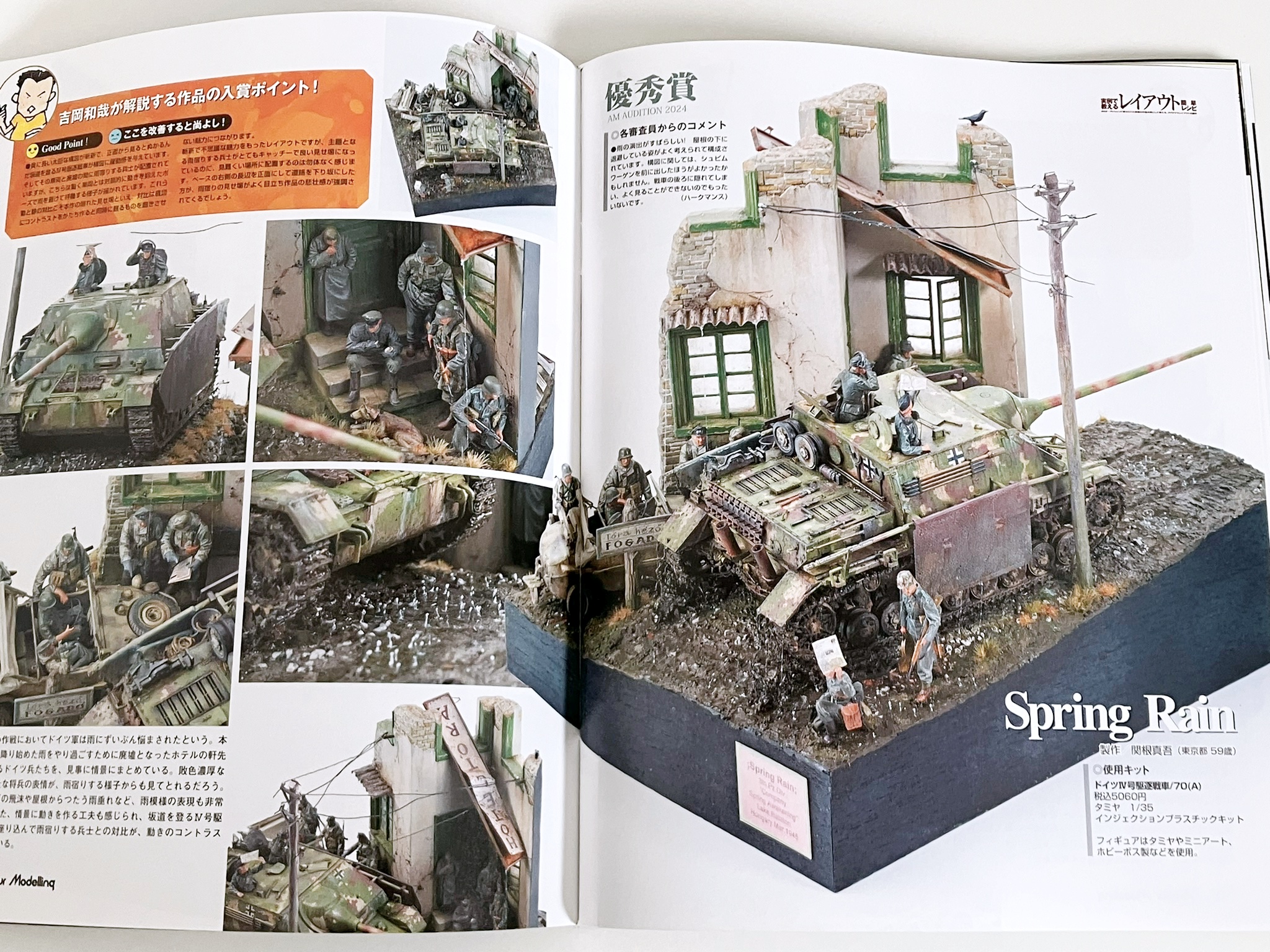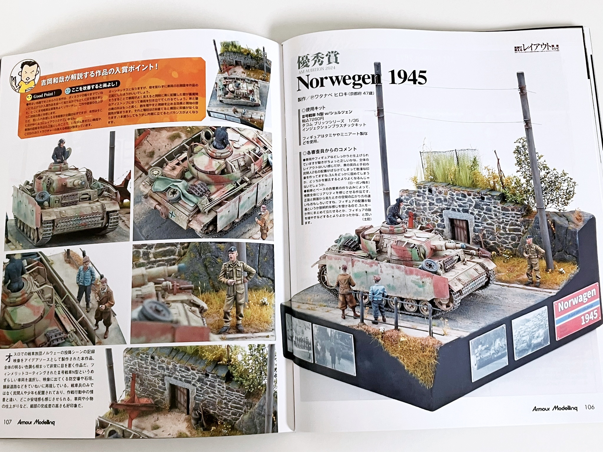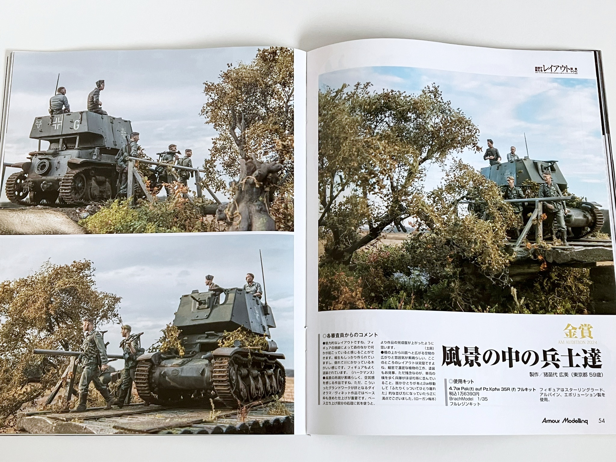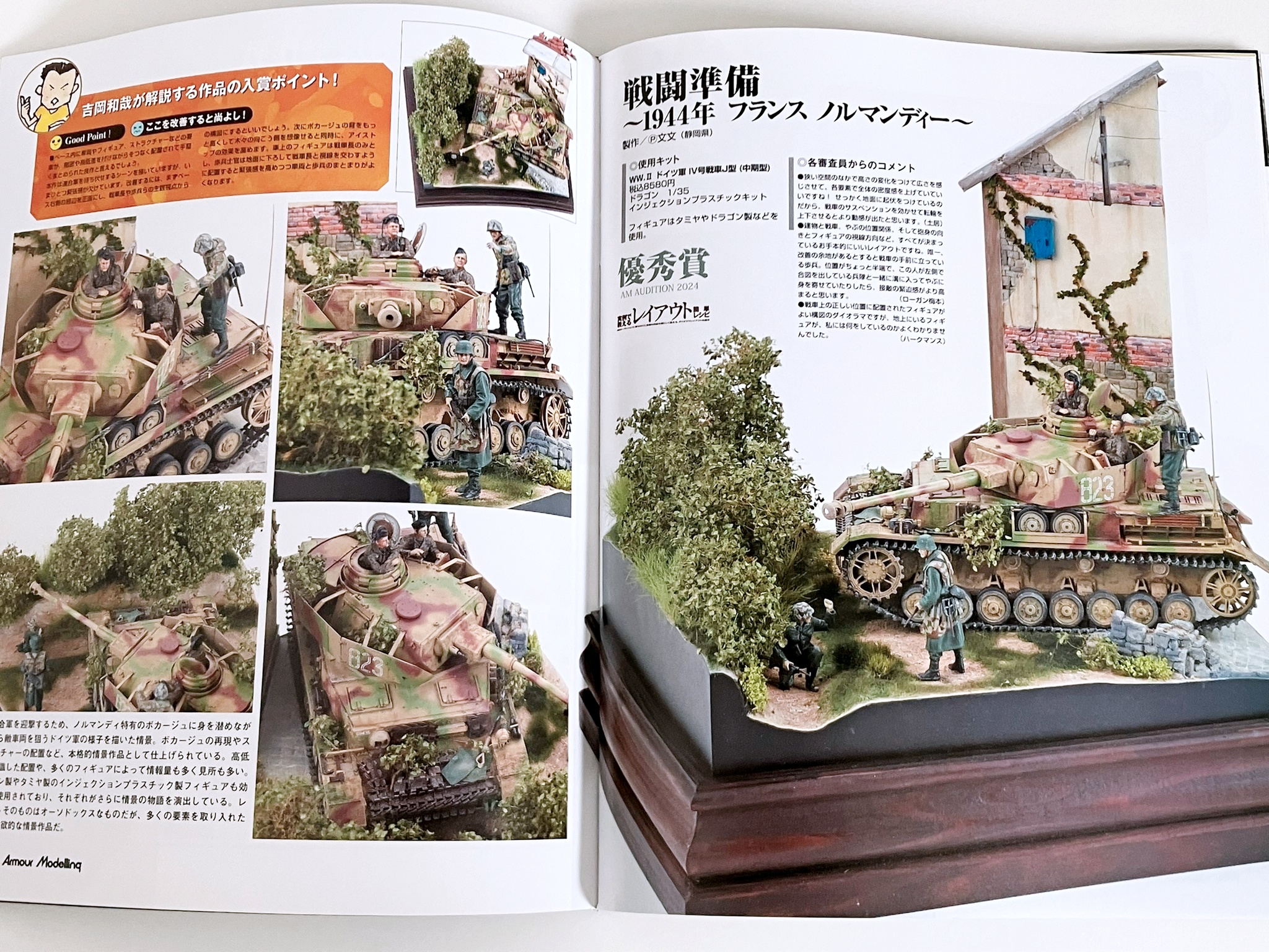 권두 특집 '실례로 알려주는 레이아웃 간단 레시피'. 일본을 대표하는 레이아웃의 명인, 요시오카 카즈야님에게 레이아웃의 중요성을 차분히 배우자! 우선은 프로의 모델과 요시오카 씨의 상세한 해설을 보면서 능숙한 레이아웃은 무엇인지 제대로 배운다. 배우면 실천하는 것으로, 레이아웃 강좌를 급히 개최. 편집부원들이 여러가지 상황의 레이아웃을 만들어, 그것을 요시오카씨에게 첨삭시킨다. 피규어, 스트럭처를 조금만 움직이는 것만으로, 확 분위기가 바뀌는 모습을 보면 레이아웃의 중요성을 이해할 수 있을 것입니다. 또 AM 오디션 2024 결과 발표도 게재.80개가 넘는 응모 작품을 일거에 공개!