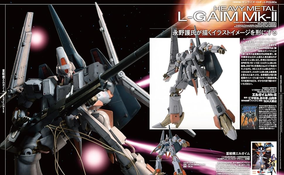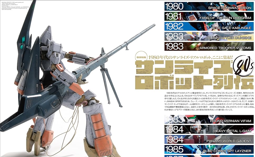 건담 시리즈 이외의 선라이즈 로봇의 매력을 보여드리는 작례기획이 오랜만에 돌아왔습니다! 이번에는 각 제조사에서 새롭게 잇달아 출시되고 있는 1980년대 리얼 로봇을 픽업. 본지가 자랑하는 톱 모델러들이 집결해, 최신 키트나 추억의 그 키트를 철저 개조. 초절작례를 기본으로 메카닉, 작품의 매력에 다가갑니다.