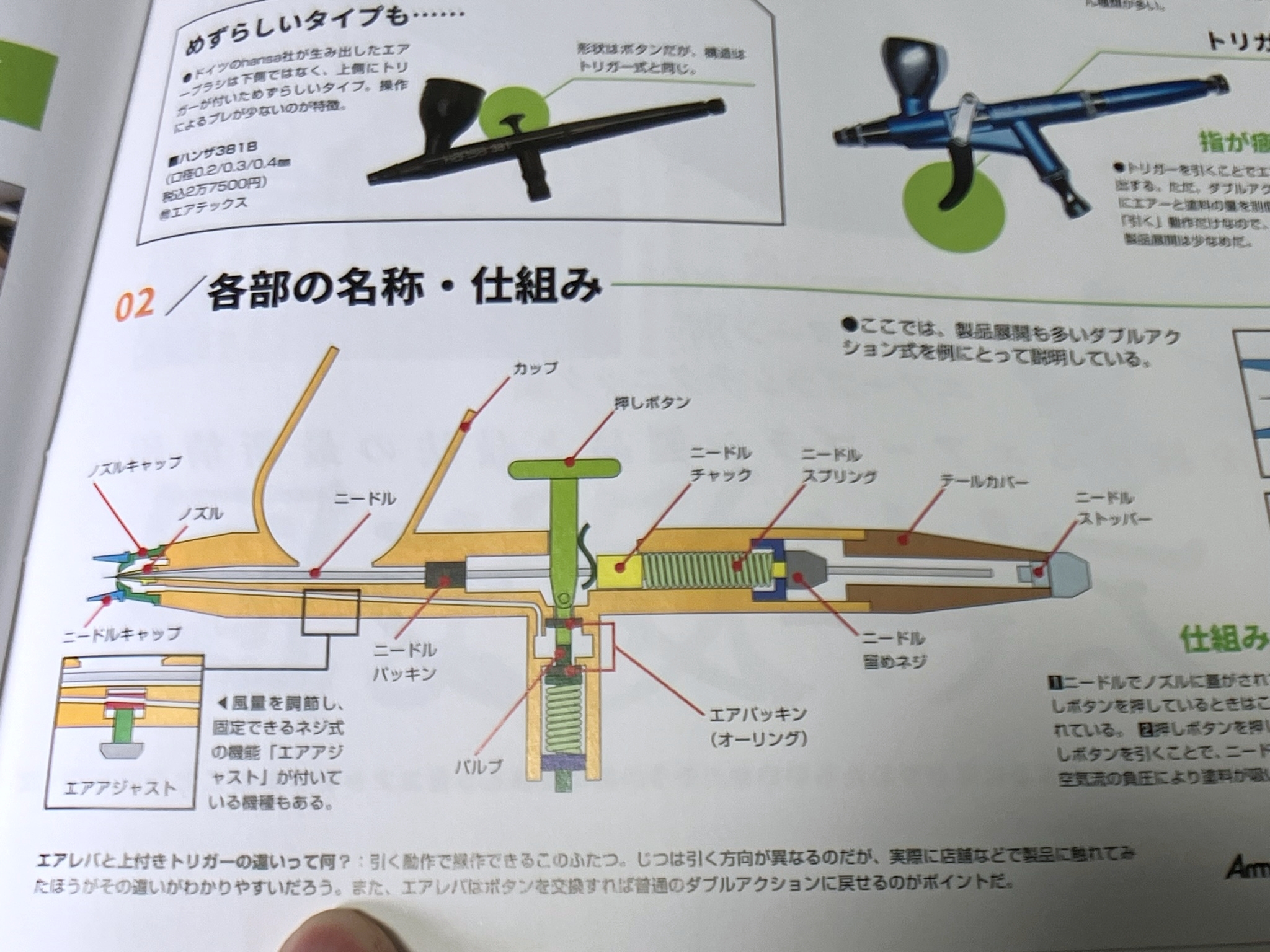 해부도는 도료의 농도로 여러가지 골치아픈 일을 겪으신 분들이라면, 누구나 눈감고도 조립할 수 있는 경지에 도달 하셨을 겁니다. 그런데 에어레버식 이라는 묘한 에어브러시가 보입니다. 기존 더블 액션 에어브러시는 누르고, 당겨서 도료를 분사하는 구조로 되어 있습니다만, 이 레버의 덕분에 당기는 동작 만으로 도료 분사가 가능해진다고 합니다.