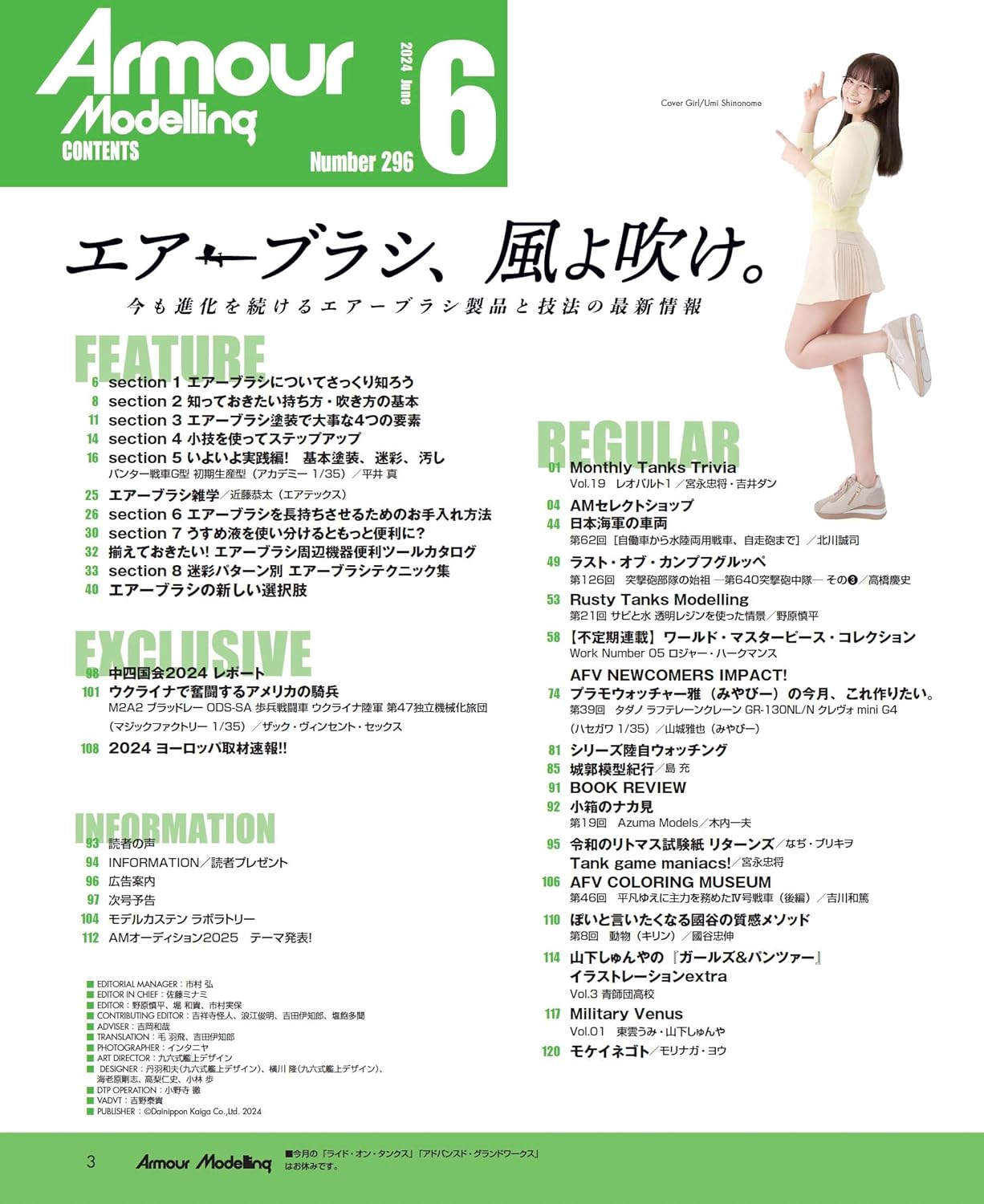월간 아머모델링 2024년 6월호 권두특집 「에어브러쉬, 바람아 불어라.」 커버걸은 그라비아계 뿐만 아니라 모형계에서도 인기있는 시노노메 우미씨! 6월호에서는 에어브러쉬의 기초·응용을 다시 학습합니다. 기초편에서는, 메이커로 부터 기종 선택에 대한 좋은 준비 방법 등을 배웠습니다. 실천편에서는 전차 모형에서의 에어브러쉬 활용 방법과 독일군의 위장 도장 요령 등의 테크닉을 망라! 부정기 연재 「월드 마스터피스 컬렉션」에서는 세계적인 모델러, 로저 하크만스 씨의 작례도. 그리고 단기 집중 신연재 일러스트레이터×그라비아 「Military Venus」가 시동. 기념할 만한 1회는 본지에서도 친숙한 야마시타 슌야 선생님×시노노메 우미(접은 포스터 포함)! 타 잡지에서는 볼 수 없는 본지니까 그 콜라보 화보도 꼭!