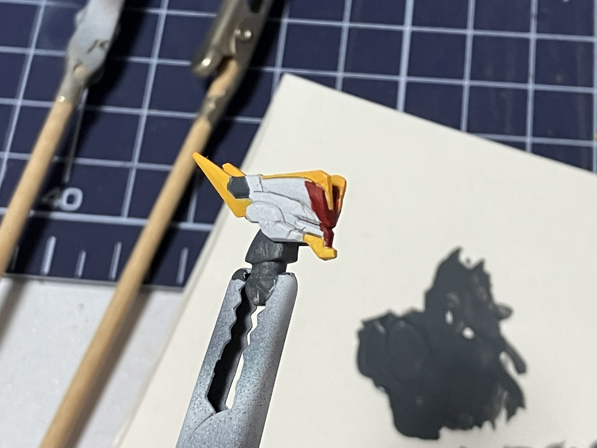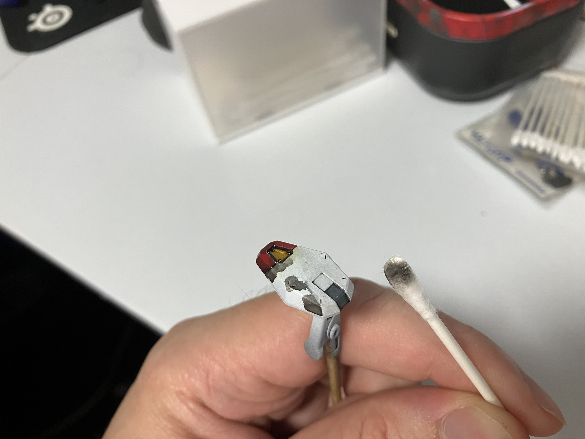 상태가 영 좋지 않습니다. 시타델 도료는 뭔가 도료를 밀어내는 느낌으로 칠하는데, 너무 뻑뻑하고 도료가 잘 안칠해집니다. 이럴 때는 수돗물을 몇방울 사용하고, 그래도 안되면 미디움을 사용해서 녹여주는 방법이 있습니다만....
