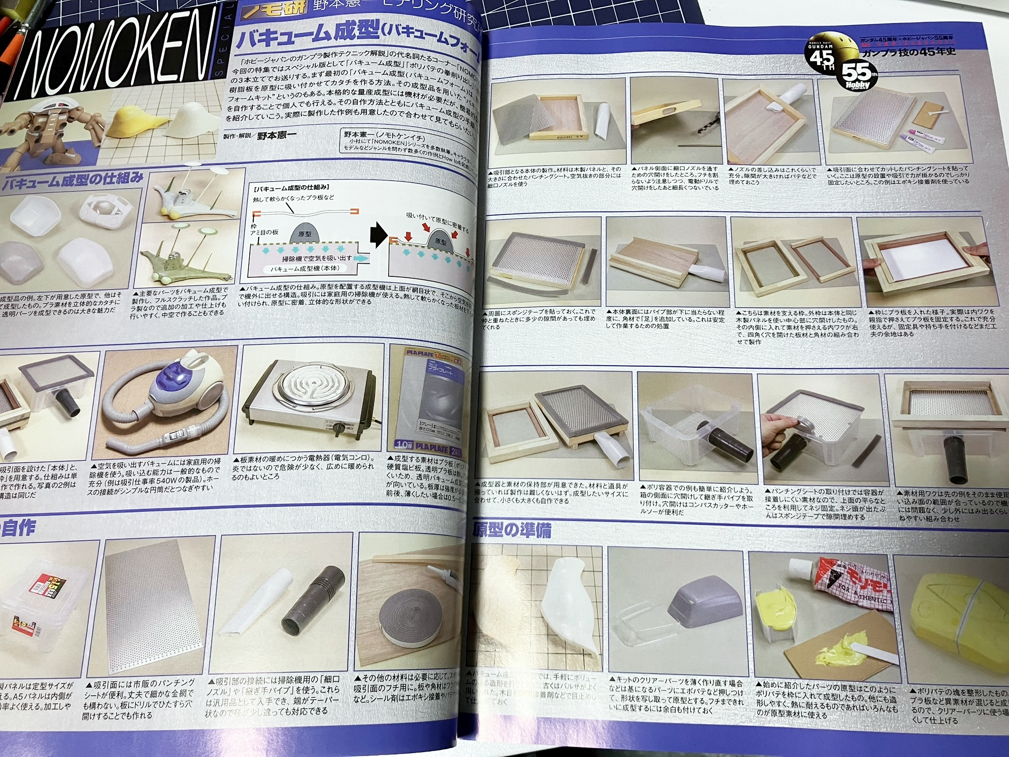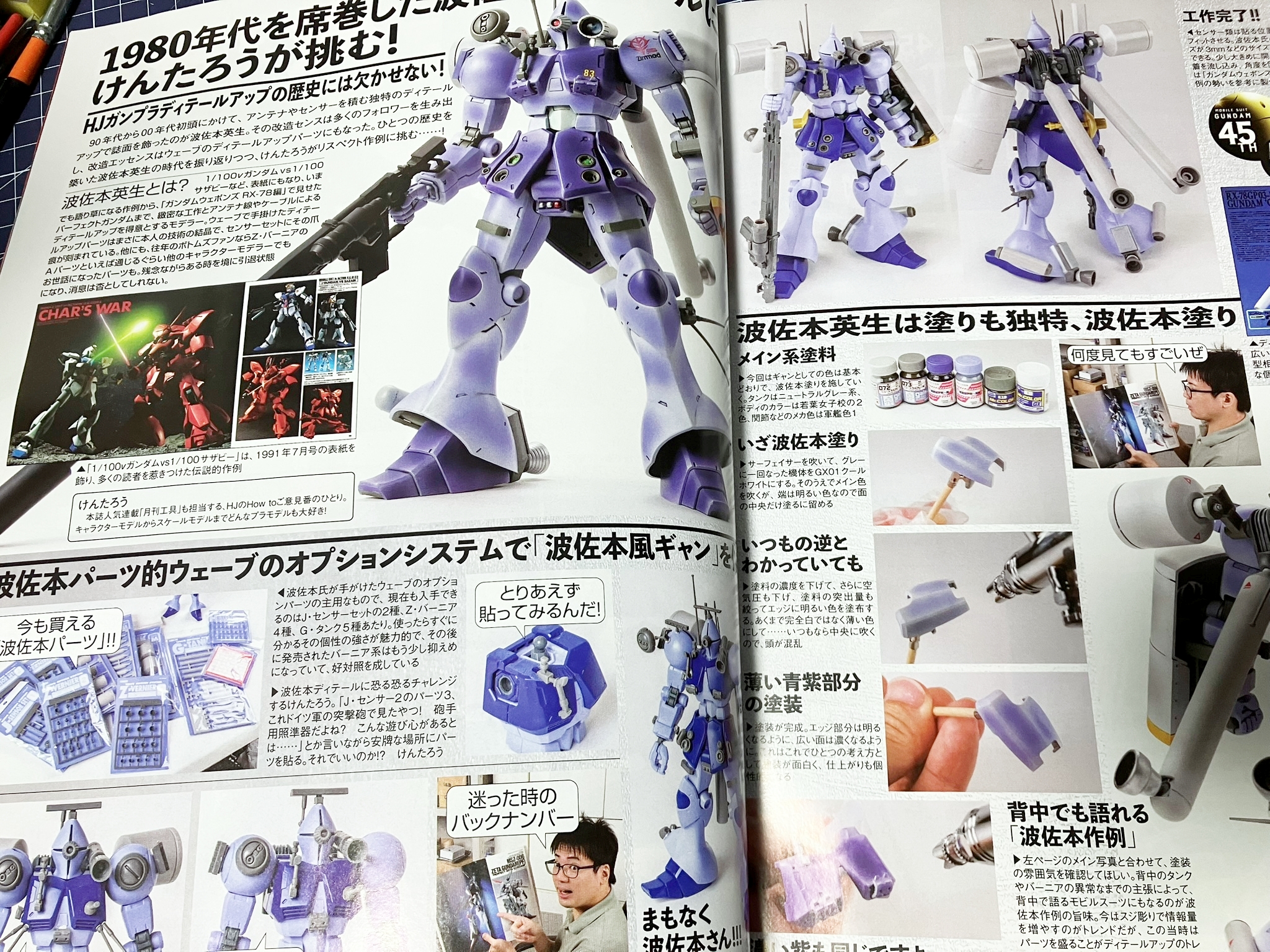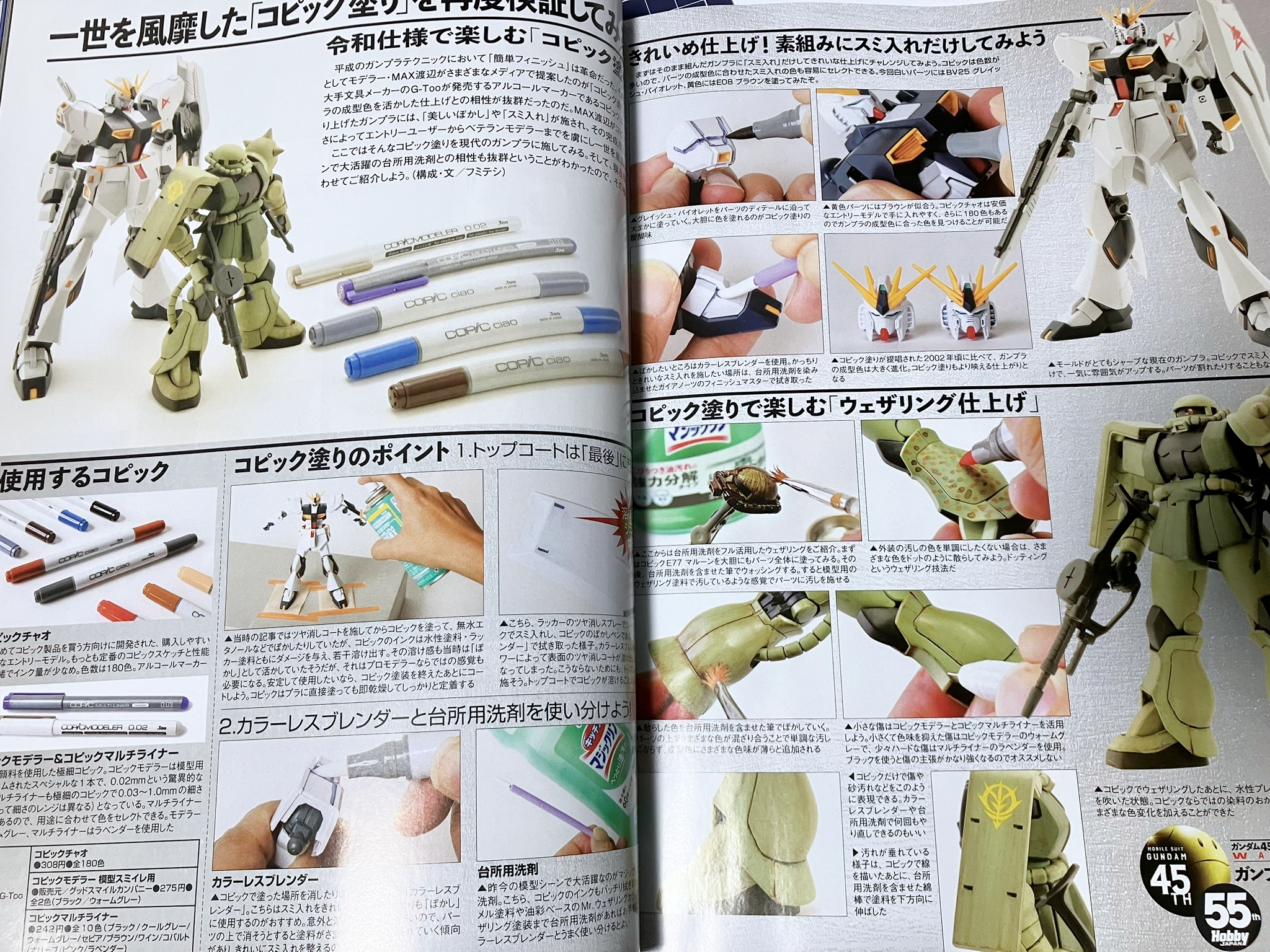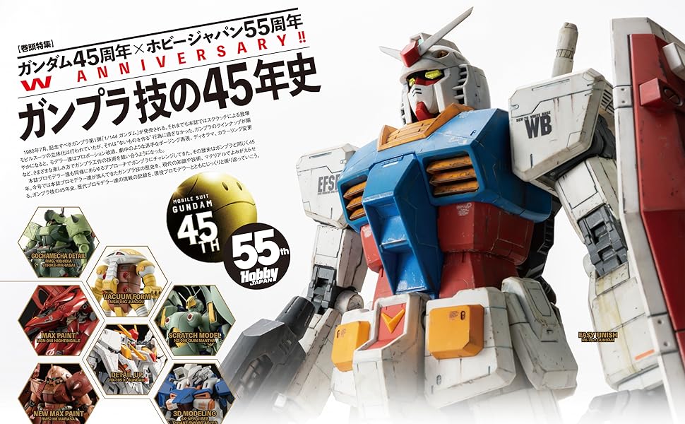 월간 하비 재팬 55주년과 건담 45주년의 더블 애니버서리 특별기획 제2탄! 월간 하비 재팬이 지금까지 만들어 온 건프라 제작 기술의 역사를 현대의 기술과 재료들로 재현. 현재 활약하는 현역 프로 모델러에 의한 How to 형식으로 다시 그 '기술'을 소개합니다.