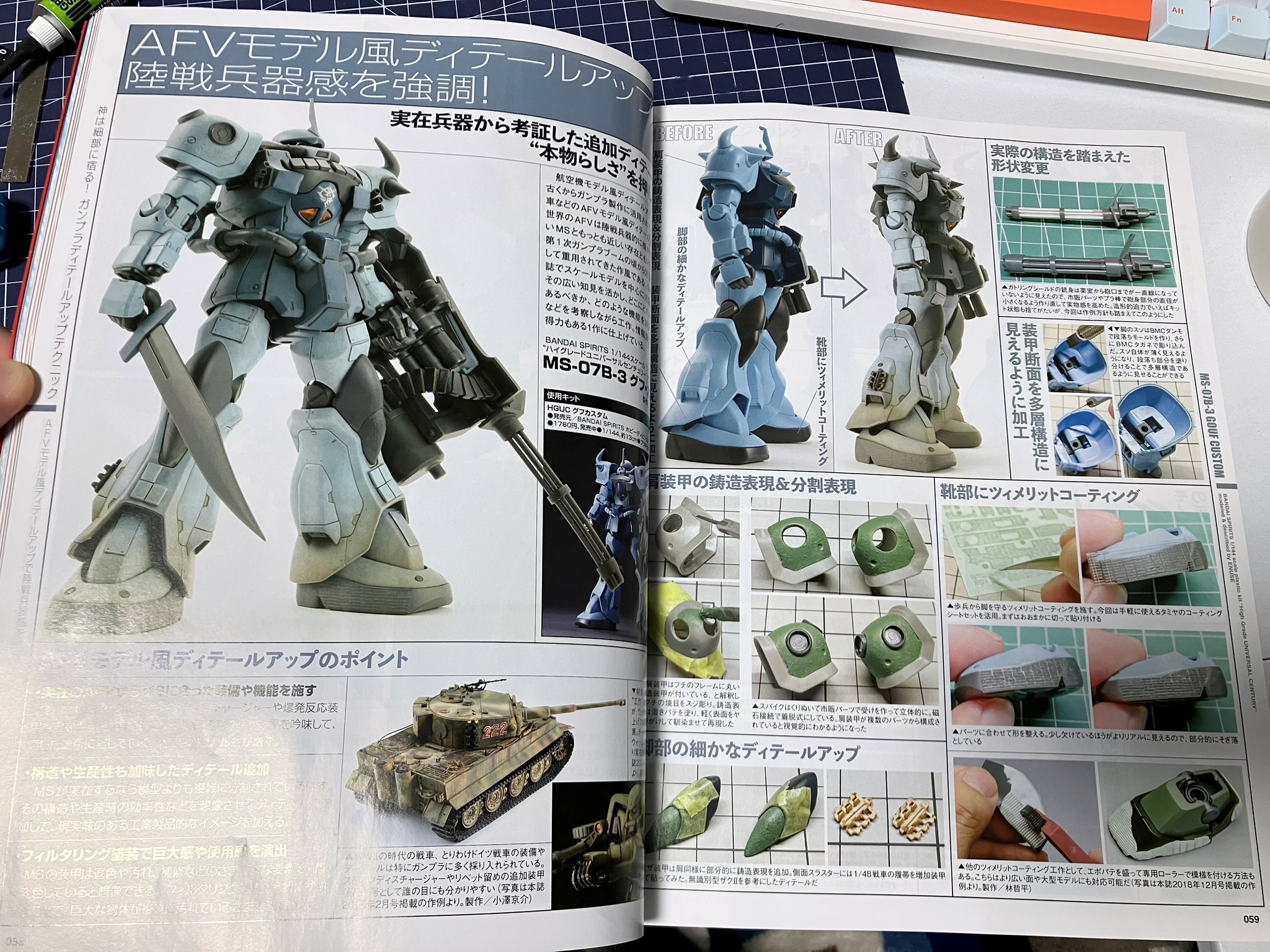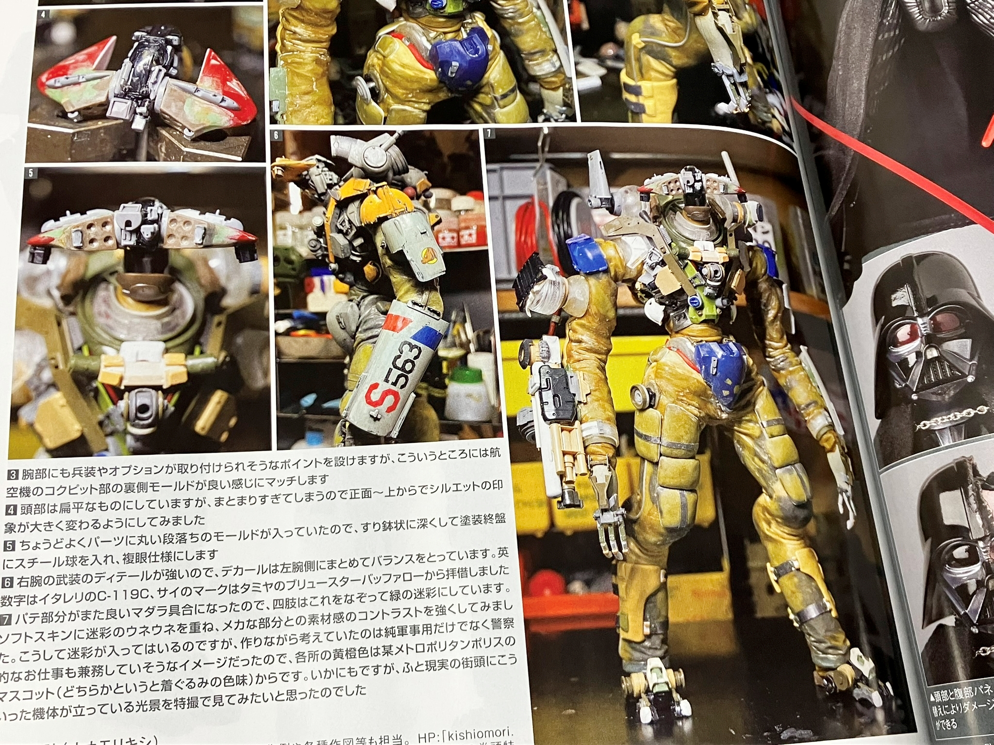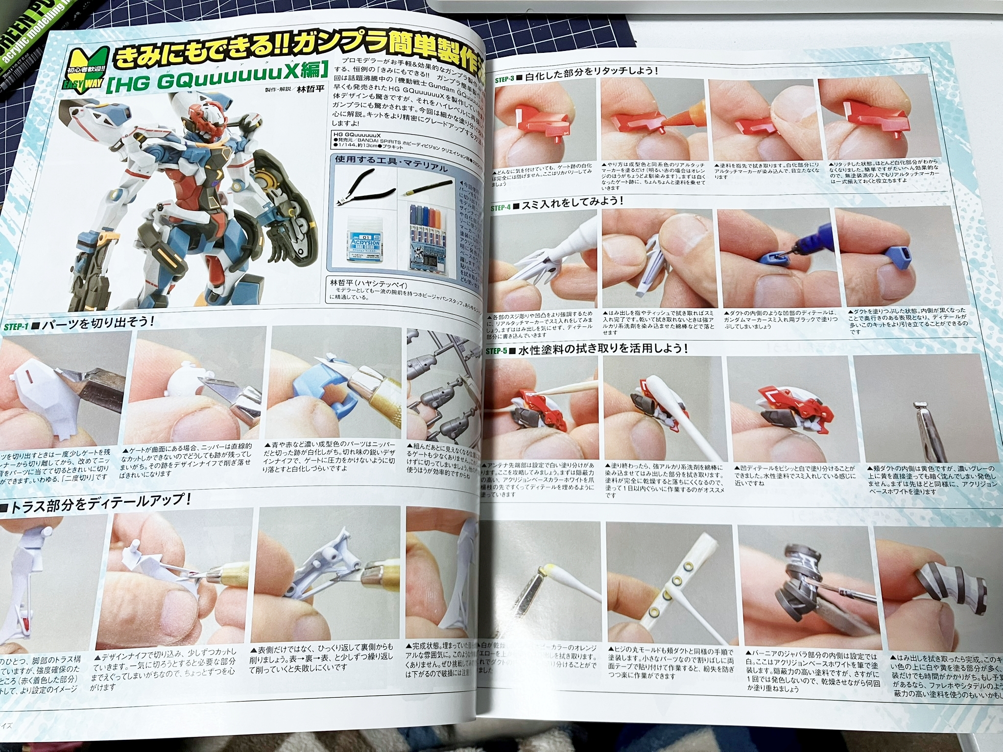 이 코너로 현재 가장 간단히 할 수 있는 테크닉은 무엇인지 확인할 수 있어 좋습니다. 이번 지쿠악스에는 아트나이프로 다듬기 + 붓이 붙은 리얼리스틱 마커 + 수성 도료를 이용한 부분도색으로 처리하고 있습니다.