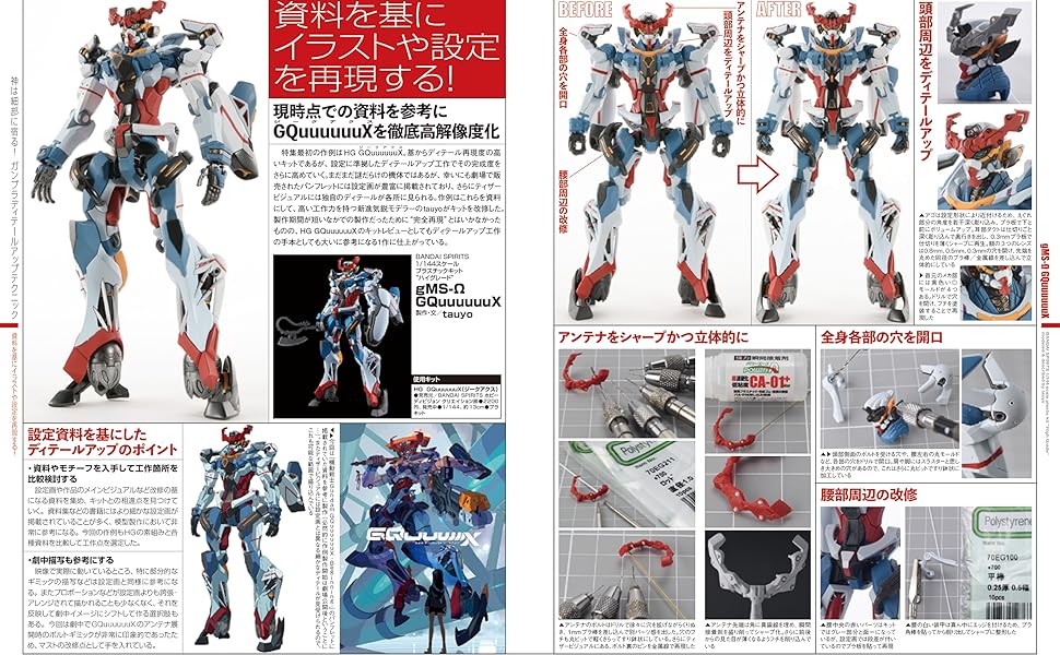 모형 제작의 묘미 중 하나는 다양한 가공을 하는 디테일 업입니다. 자신의 모형이 점점 "진짜답게" 되어가는 과정은 즐겁다는 한마디로는 부족합니다. 이번 호의 하비 재팬에서는 건프라 제작에 도움이 되는 디테일 업 테크닉을 대특집. 여러가지 방법으로 1/144 키트에 철저하게 디테일 업을 실시합니다. 대작은 세세한 완성도가 쌓여가며 만들어내는 것. 당신의 건프라 제작 라이프에도 분명 도움이 되는 기술을 듬뿍 소개합니다!