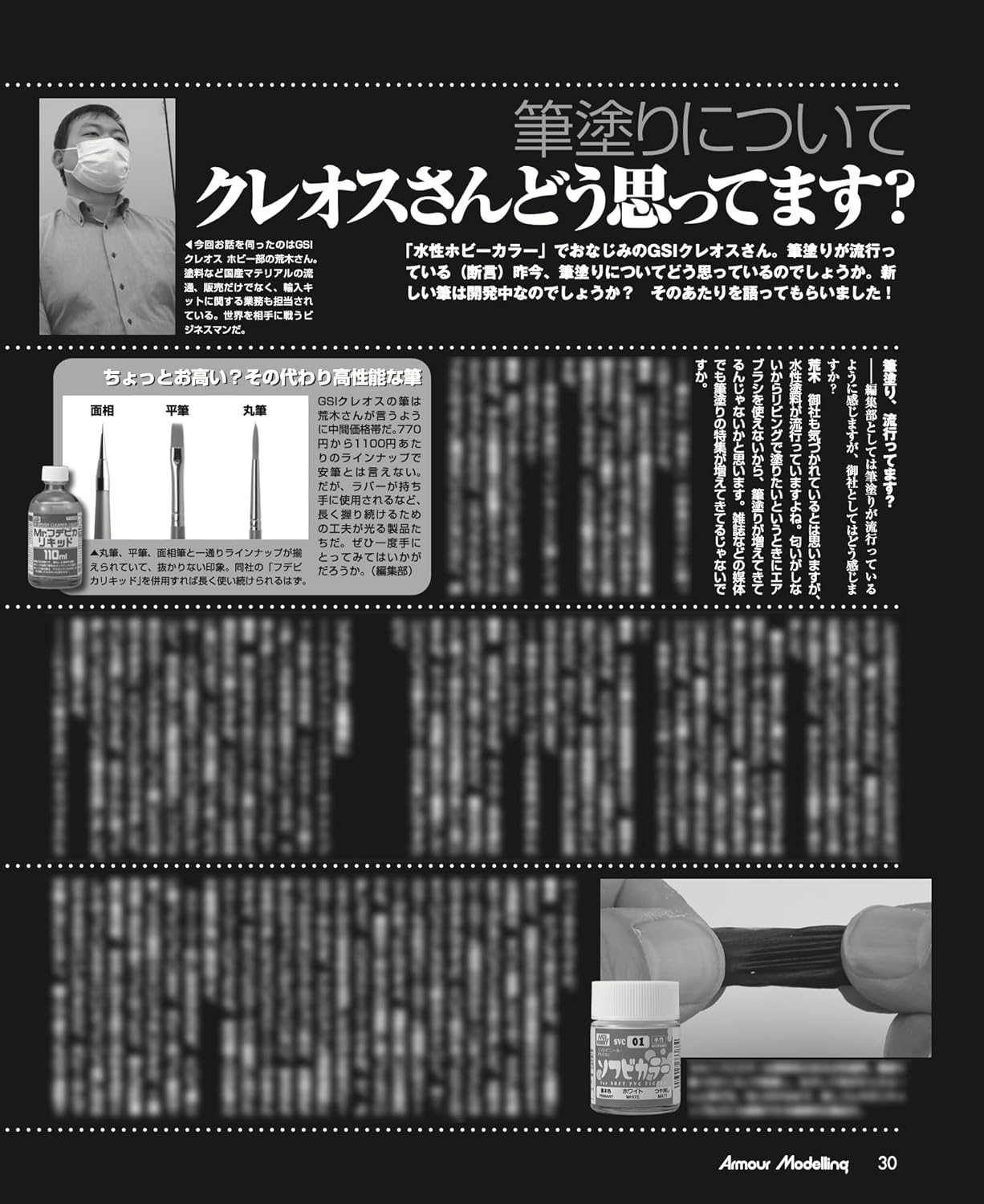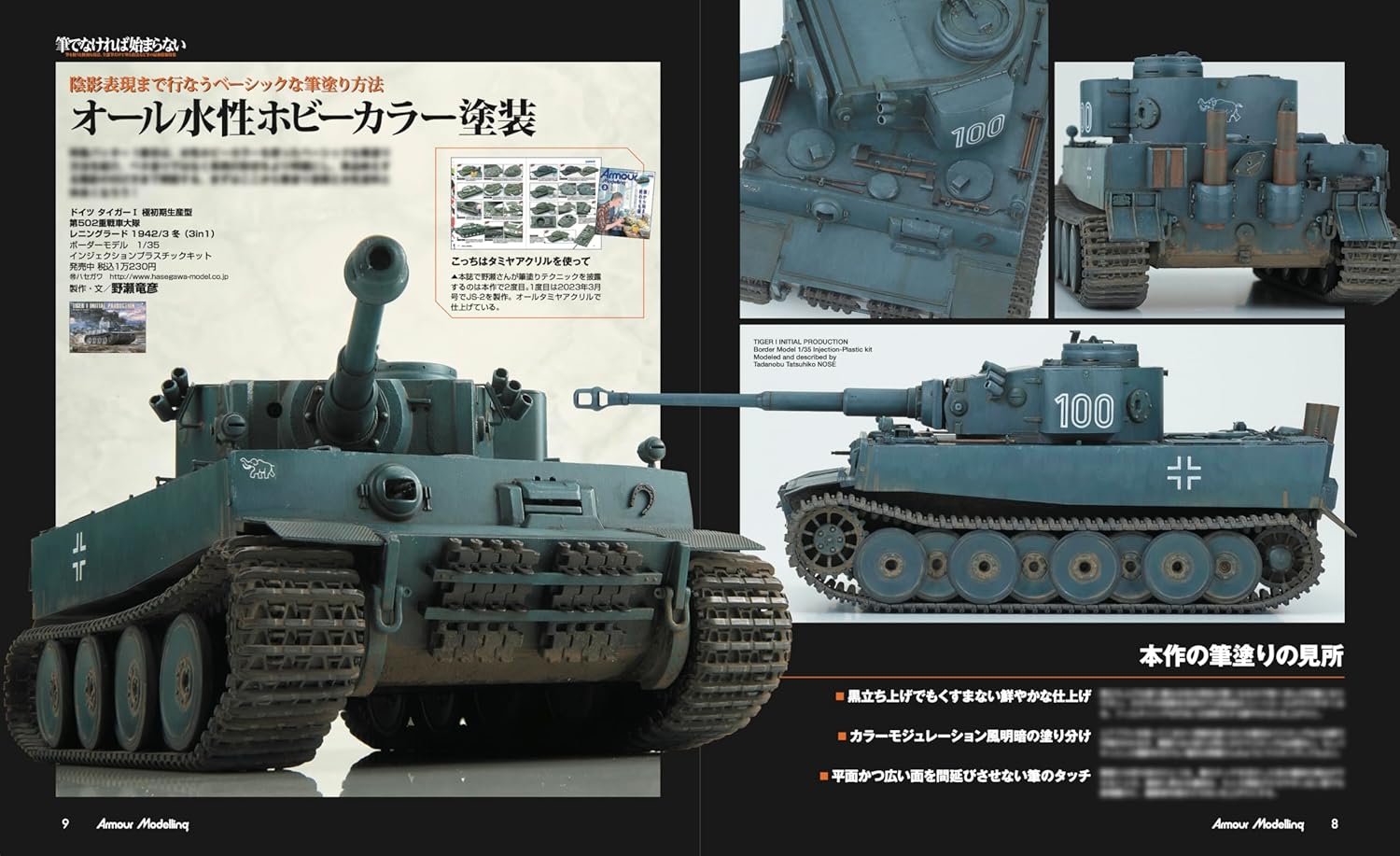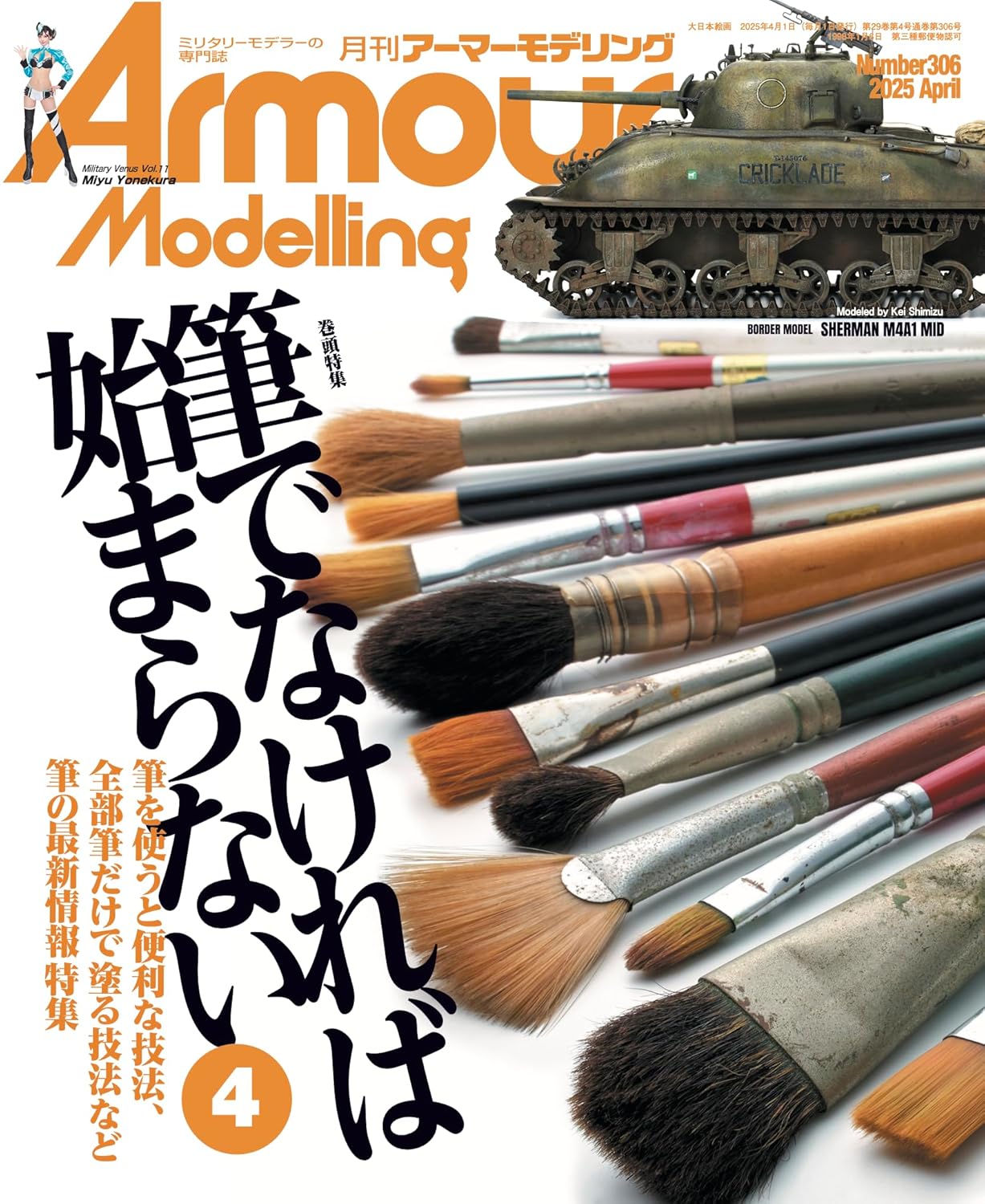 월간 아머 모델링 2025년 4월호 권두 특집 「붓이 아니면 시작할 수 없어」이번 달호의 특집은 전차 1량을 붓이나 스폰지를 사용해 마무리하는 것에 피쳐. 스테디 셀러인 아크릴계 도료를 사용한 방법이나 붓으로는 취급이 다소 어려운 래커계 도료를 사용한 능숙한 방법등을 작례로 정중하게 소개. 게다가 도장을 보다 부담없이 할 수 있게 키트의 성형색을 살리면서 스폰지와 붓만으로 마무리하는 방법도 있습니다. 읽고 나면 손을 움직이고 싶어 죽겠어! 에어브러쉬를 사용하지 않고 한 두 번 발라보고 싶은 분, 붓칠을 더 잘해 보이는 요령을 알고 싶은 분들에게는 안성맞춤인 한 권입니다. 또, 연재「밀리터리 비너스」에서는「키 큰 여자」로 화제가 되었던 요네쿠라 미유가 본지의 친숙한 인기 일러스트레이터 야마시타 슌야와 콜라보!
