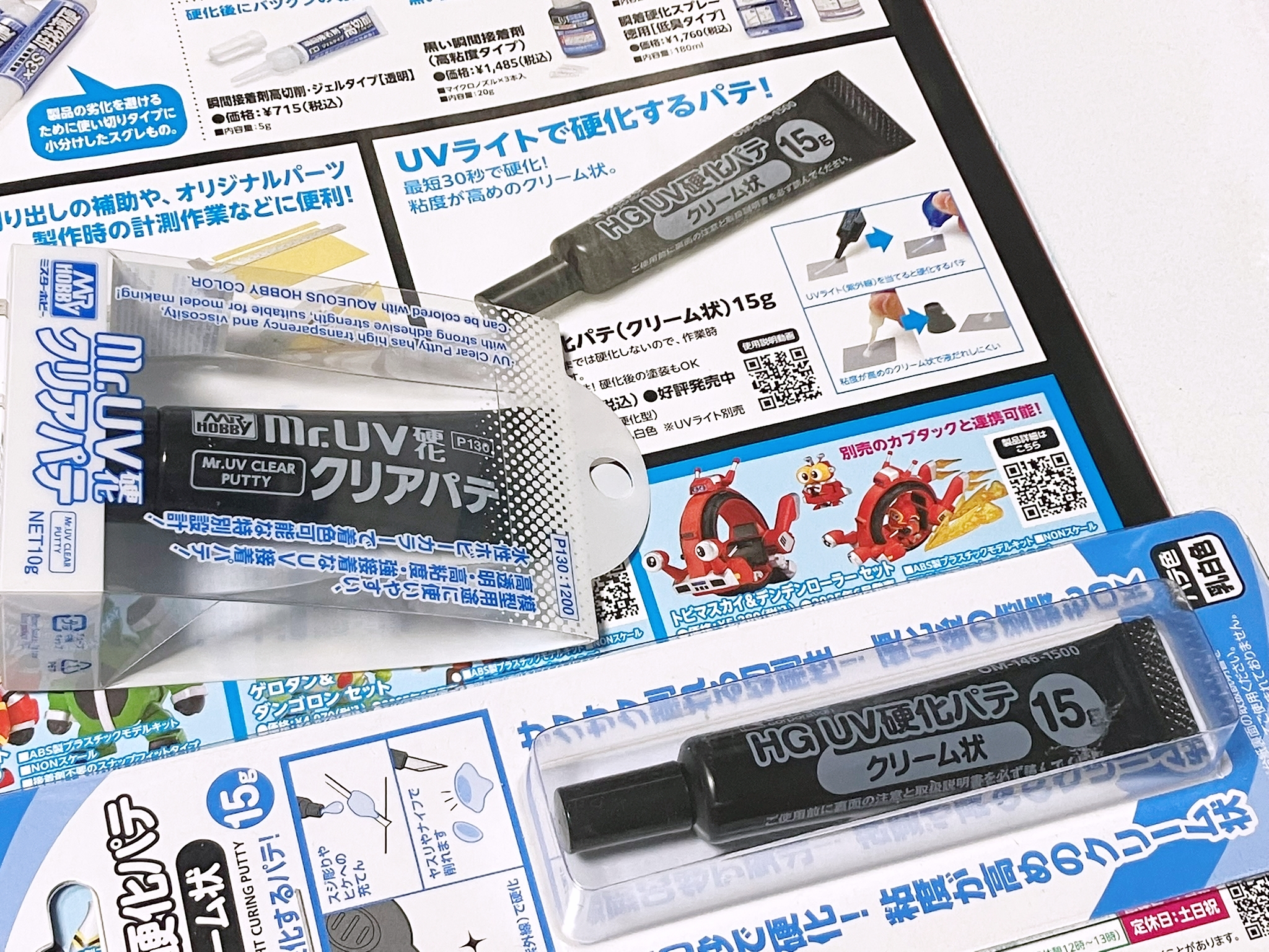 미스터 하비의 미스터 UV 경화 클리어 퍼티와 광고의 웨이브 UV경화 퍼티. (저는 잘못해서 두개를 다 사게 되었습니다.) 둘 다 장단점이 존재하니 용도에 맞게 사용하시면 좋습니다. 미스터 하비의 경우 순간접착 젤보다 약간 물성이 있으며 굳으면 단단해집니다. 마치 클리어파츠 같은 단단함을 자랑하기에 별도의 형틀에 클리어 파츠를 만들 때 매우 좋고, 웨이브의 경우 젤과 같은 크림 형태로 되어 있고 플라스틱에 잘 붇고 굳은 후에도 약간의 탄력이 있어 가공이 쉽습니다. 공다공증의 치료를 하거나 구멍을 메우거나 상처를 메꿀때 매우 좋습니다.