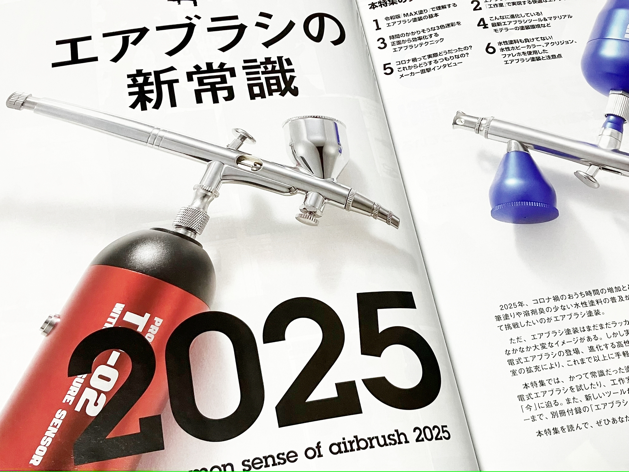 이번 호에서는, 변해가는 에어 브러시 도장의 '지금'에 접근합니다. 최신의 제품 동향이나 메이커에의 독점 인터뷰를 통해서, 에어 브러시의 장래를 응시한 「새로운 상식」을 밝혀냅니다. 또한, 도입을 망설이는 초보자부터 교체를 검토하는 베테랑까지 활용할 수 있는 '에어브러시 카탈로그 2025'도 별책 부록으로 수록! 이번 봄, 새로운 생활과 함께 당신의 프라모 라이프에도 새로운 바람을 불어넣어 보지 않겠습니까?