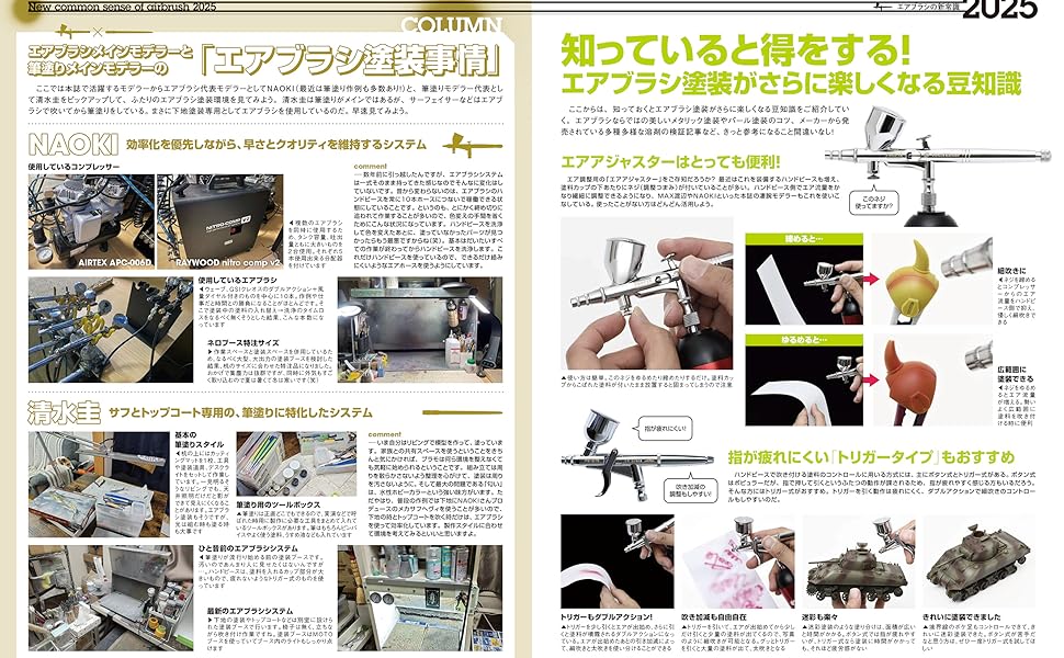 2025년 코로나 사태를 거치면서 집에 틀어박혀 있게 되는 시간이 늘어남과 동시에 모형 제작에 대한 건강 의식이 높아져서 붓칠과 수성 도료의 보급이 빠르게 진행되었습니다. 도장의 즐거움을 알게 된 지금, 다음 걸음으로서 도전하고 싶은 것이 에어 브러시 도장. 도입 허들이 높다고 생각되는 에어 브러시입니다만, 실은 지금 도입하기 쉬운 환경이 정비되고 있습니다. 충전식 에어브러쉬의 등장, 진화하는 고성능 도장 부스나 컴프레서, 또 전국 각지에 퍼지는 공방의 확충에 의해, 지금까지보다 손쉽고 쾌적하게 도장을 즐길 수 있는 시대가 도래하고 있습니다.