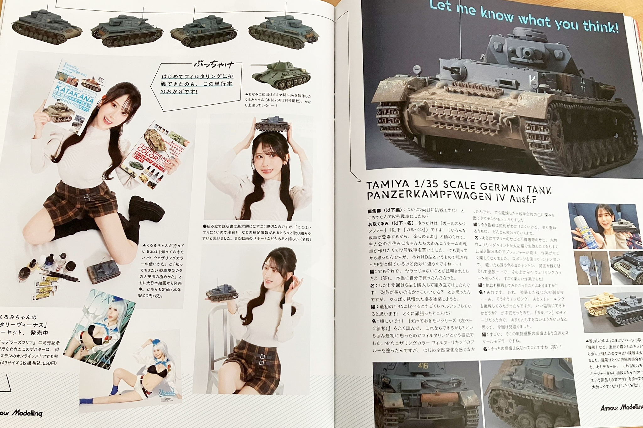 월간 아머 모델링 2025년 5월호 권두 특집 'Ⅳ호 전차라면 저것도 만들 수 있고, 이것도 만들 수 있고' 이번 호는 Ⅳ호 특집. 표지는 '애니메쥬' 1994년 3월호의 표지를 장식한 미야자키 하야오 감독의 Ⅳ호 일러스트! 왜 이 Ⅳ호의 일러스트가 탄생했는지, 그 줄거리를 되돌아보는 기사도 게재. 또한 일본을 대표하는 박스아트 일러스트레이터 오오니시 마사미 화백에게 Ⅳ호 전차에 대한 생각을 물었습니다. 그리고 작례도 충실. A, D, F, G, H, J형의 작례를 통하여 각각의 해설로 그 차이를 게재. 더 나아가 대표적인 국내외 업체의 Ⅳ호 제품 구성, 특징을 소개합니다. 그리고 전 호에서 T-34를 제작한 나토리 쿠루미 씨가 이번에는 Ⅳ호 전차에 도전! 초보자로서의 의지와 도전 등을 물어보았습니다. 전부 Ⅳ호 만들기의 한 권으로 되어 있어요!