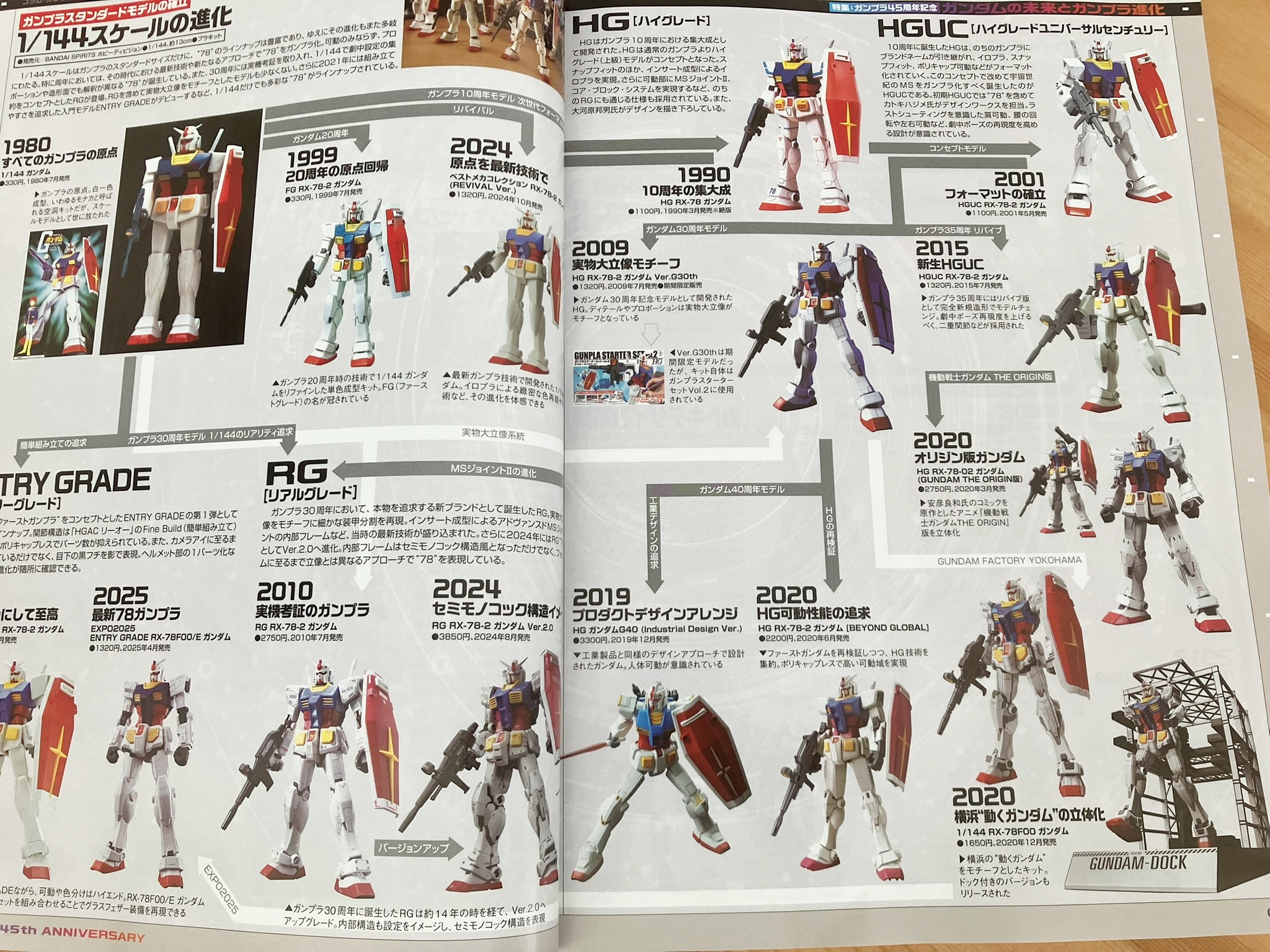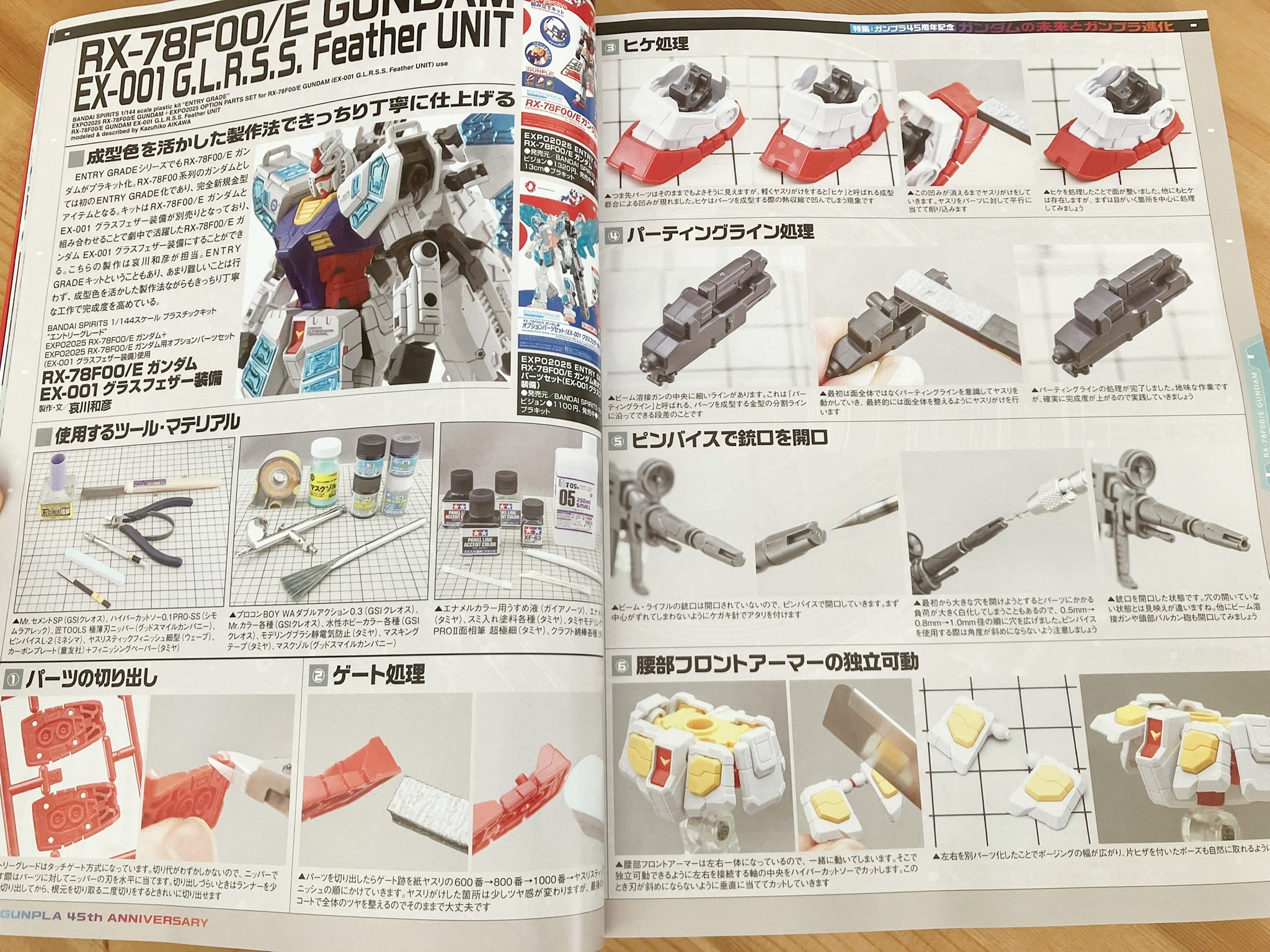 2025년은 건프라가 탄생한 지 45주년을 맞이하는 해입니다. 지금까지도 매 주년마다 새로운 건프라와 다양한 컨텐츠가 전개되어 왔습니다만, 금년은 4월 13일부터 개최되고 있는 「EXPO 2025 오사카·간사이 만국박람회」의 「GUNDAM NEXT FUTURE PAVILION(이하 건담 파빌리온)'이 주목을 받고 있습니다. 본 특집에서는 건담 파빌리온의 리포트를 필두로, 그 파빌리온과 밀접한 관계에 있는 건프라「EXPO2025 1/144 RX-78F00/E 건담(EX-001 글래스 페더 장비)」의 키트 리뷰 작례를 게재. 건프라 진화의 역사를 해설한 칼럼 등도 포함하여 '건담'과 미래가 어떻게 연결되어 갈 것인지, 그리고 건프라는 앞으로 어떻게 진화해 나갈 것인지를 살펴봅니다.