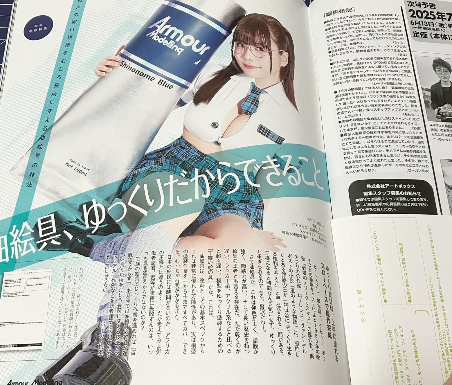 월간 아머 모델링 2025년 6월호 권두 특집 「애시당초 미채가 뭘까?」미채 도장은 어떤 색으로 칠할 것인지, 어떤 패턴으로 할 것인지, 어떤 재료를 사용할 것인지…등, 생각할 것들이 많아집니다. 본 호의 권두 특집에서는 그런 고민을 조금이라도 해소할 수 있는 방법을 전수. 미채 도장 전에 생각해야 할 4가지 사항과 붓칠, 에어브러쉬 등 재료 별 방법을 해설. 또한 어렵다고 하는 가는선을 이용한 에어브러시 미채 도장 요령을 소개! 이와 더불어 미채가 언제 생겨나 활용되어 왔는지, 애초에 '미채'의 정의란?이라는 지적 호기심을 자극하는 읽을거리도 준비. 읽고 나면 미채 도장이 하고 싶어지는! 더불어 AM 오디션 2026의 테마도 발표.