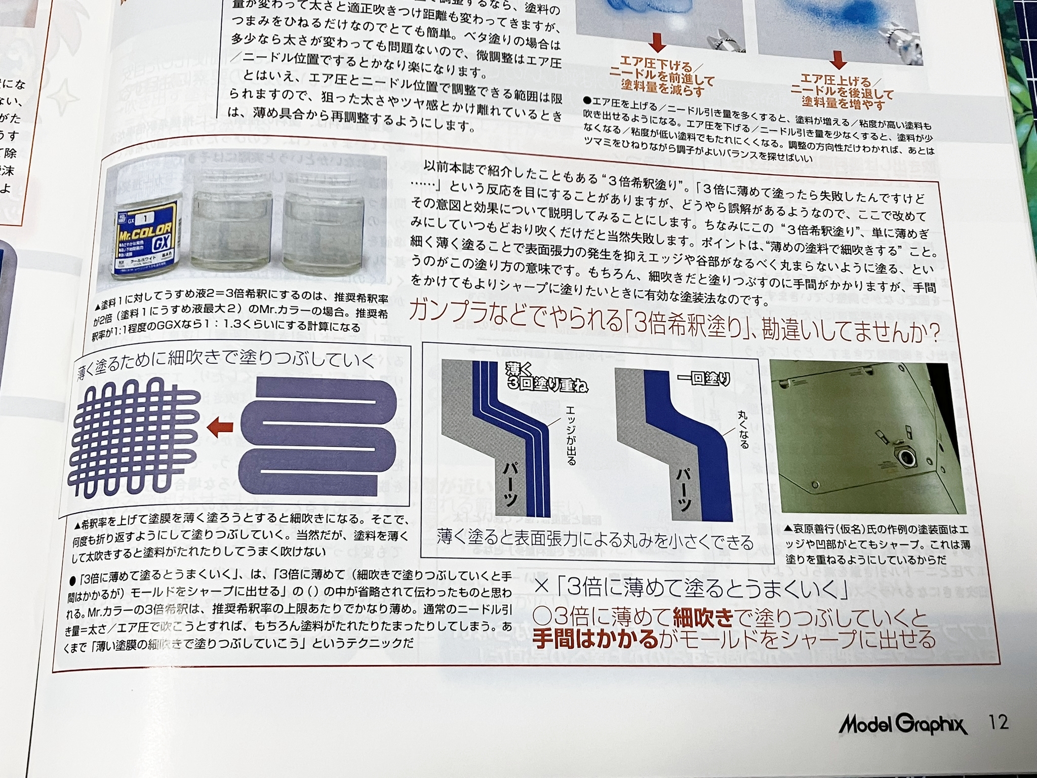 광빨 코팅을 매우 좋아하는 한국의 모델러들에게는 자주 나타나는 각 뭉개짐 문제는 티가 상당히 많이 나기에 잘 조절해서 해야 합니다. 본지에서는 빠르고 엷게 뿌리는 것이 관건이라고 설명하고 있습니다. 물론 농도도 너무 진하지 않게 하는 것이 중요합니다.