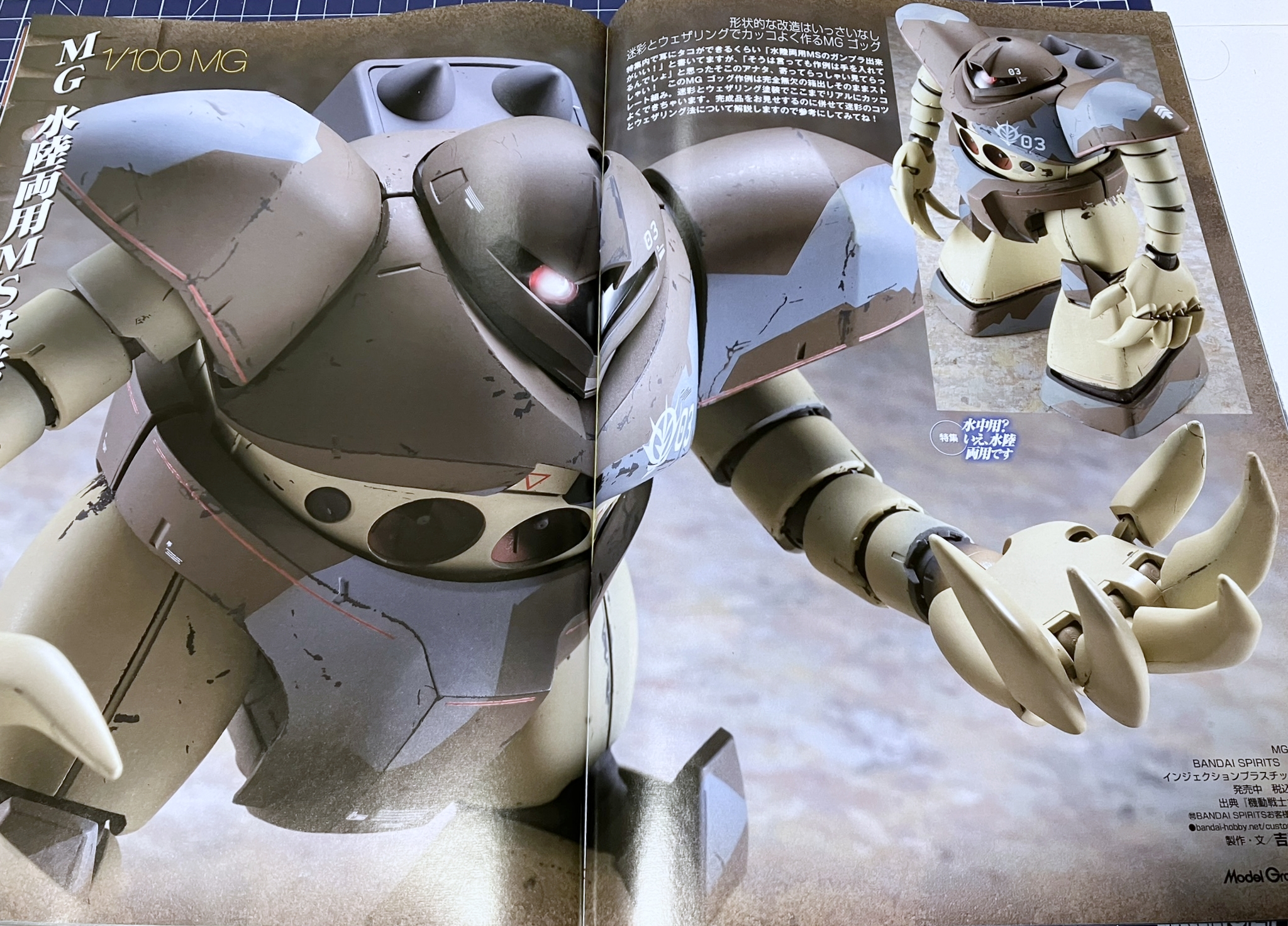 '지온군 수영부' 등으로 불리기도 하는 수륙양용 MS. 수중에서 싸울 수 있다는 점이 부각되지만, 수중에서도 육상에서도 싸울 수 있다는 것은 = 2배 즐겁잖아! 수중에만 주목하는 것은 아깝다! 라는 것이 이번 특집을 기획한 시작점이었습니다. 그래서 생각해 본 것이 커버 모델이 된 즈고크의 상륙 미채. 「물」과 「육지」의 틈새에 있는 수륙 양용 MS의 재미, 그리고 멋짐을 미채로 표현해 보았습니다. 물론 물속을 좀 더 형상화한 웨더링 마감도 멋있고 물가이기 때문에 할 수 있는 정경 모형 표현도 있습니다. 여러분도 수륙양용 MS이기 때문에 할 수 있는 다양한 즐길 방법을 찾아 보지 않겠습니까?