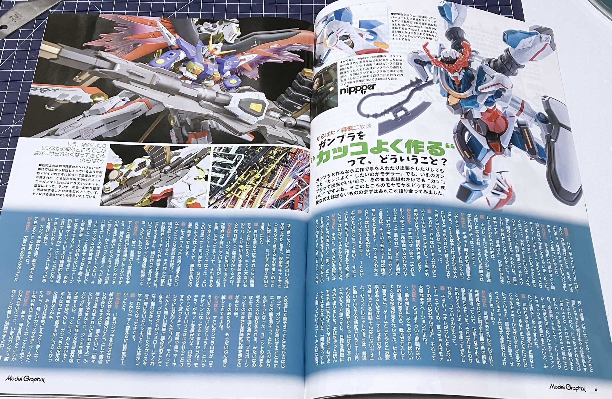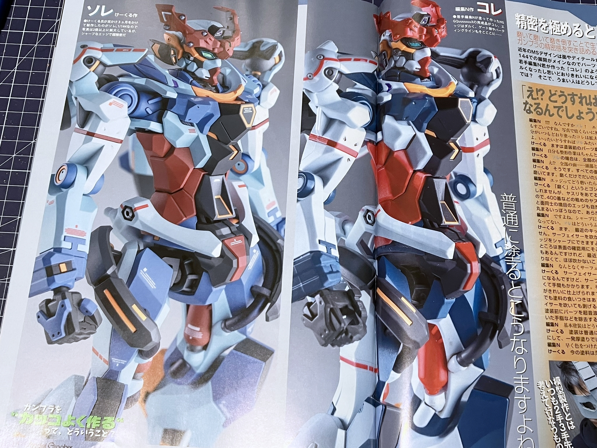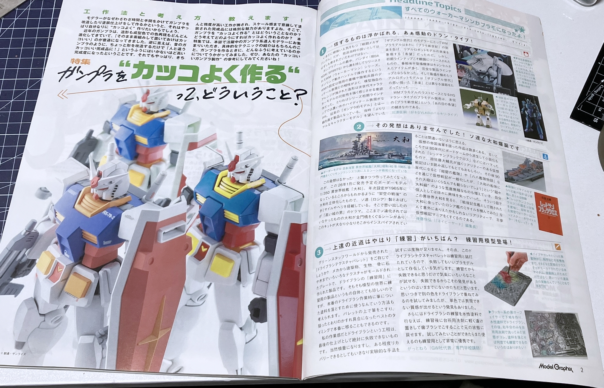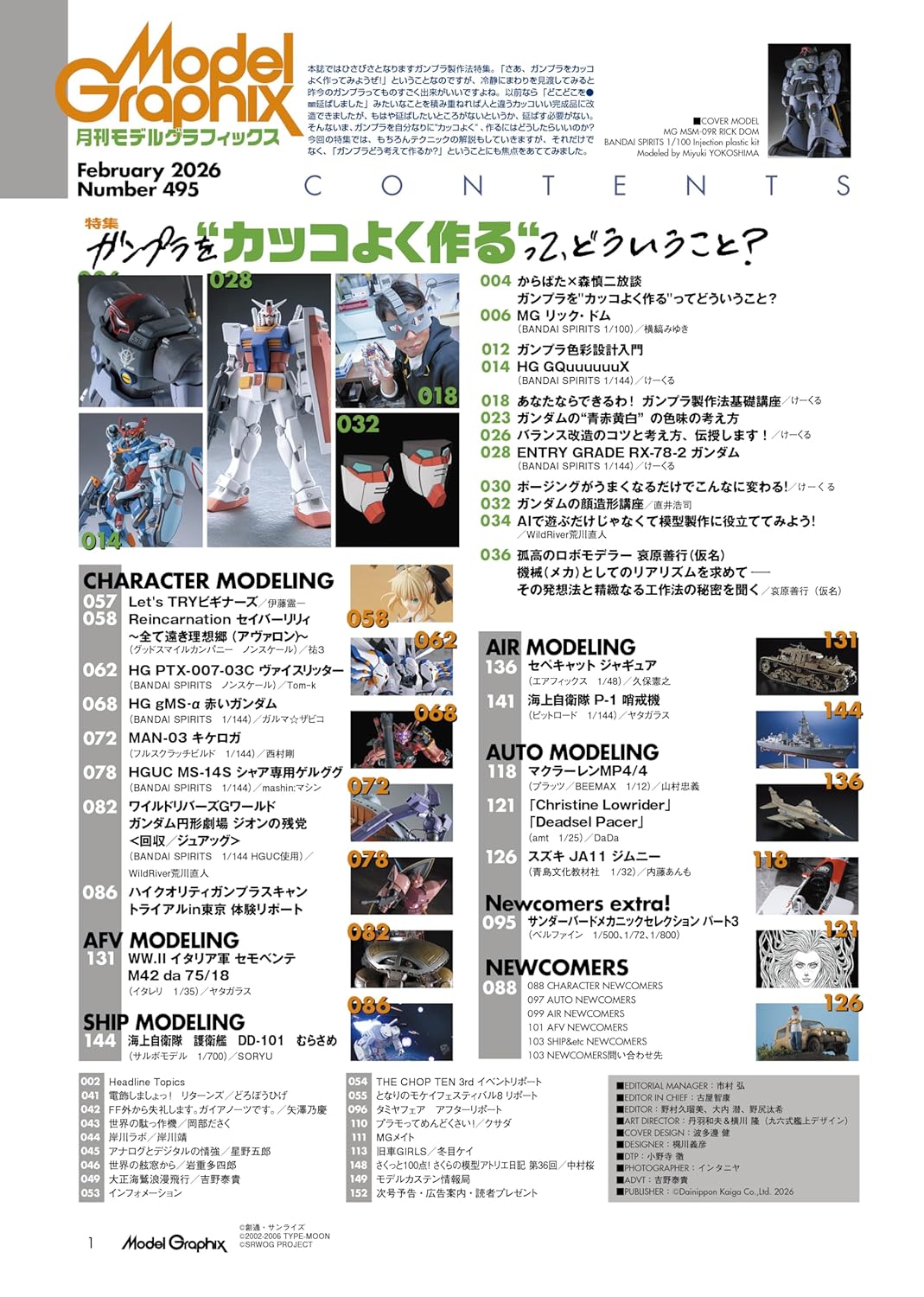 이번 호에서는 오랜만에 건프라 제작법 특집을 다룹니다. ‘자, 건프라를 멋지게 만들어 보자!’ 라는 말인데, 차분히 주변을 둘러보자면 요즘 건프라는 정말 퀄리티가 뛰어나죠. 옛날이라면 '어디를 몇mm 늘렸어요' 같은 식으로 차근차근 쌓아나가 남들과 다른 멋진 완성품으로 개조할 수 있었지만, 이제는 늘리고 싶은 부분도, 늘릴 필요도 없다는 느낌입니다. 지금은, 건프라를 내 방식대로 '멋지게' 만들려면 어떻게 해야 할까? 이번 특집에서는 물론 기술 해설도 진행하지만, 그뿐만 아니라 ‘건프라를 어떻게 생각하고 만들 것인가?’라는 점에도 초점을 맞추었습니다.