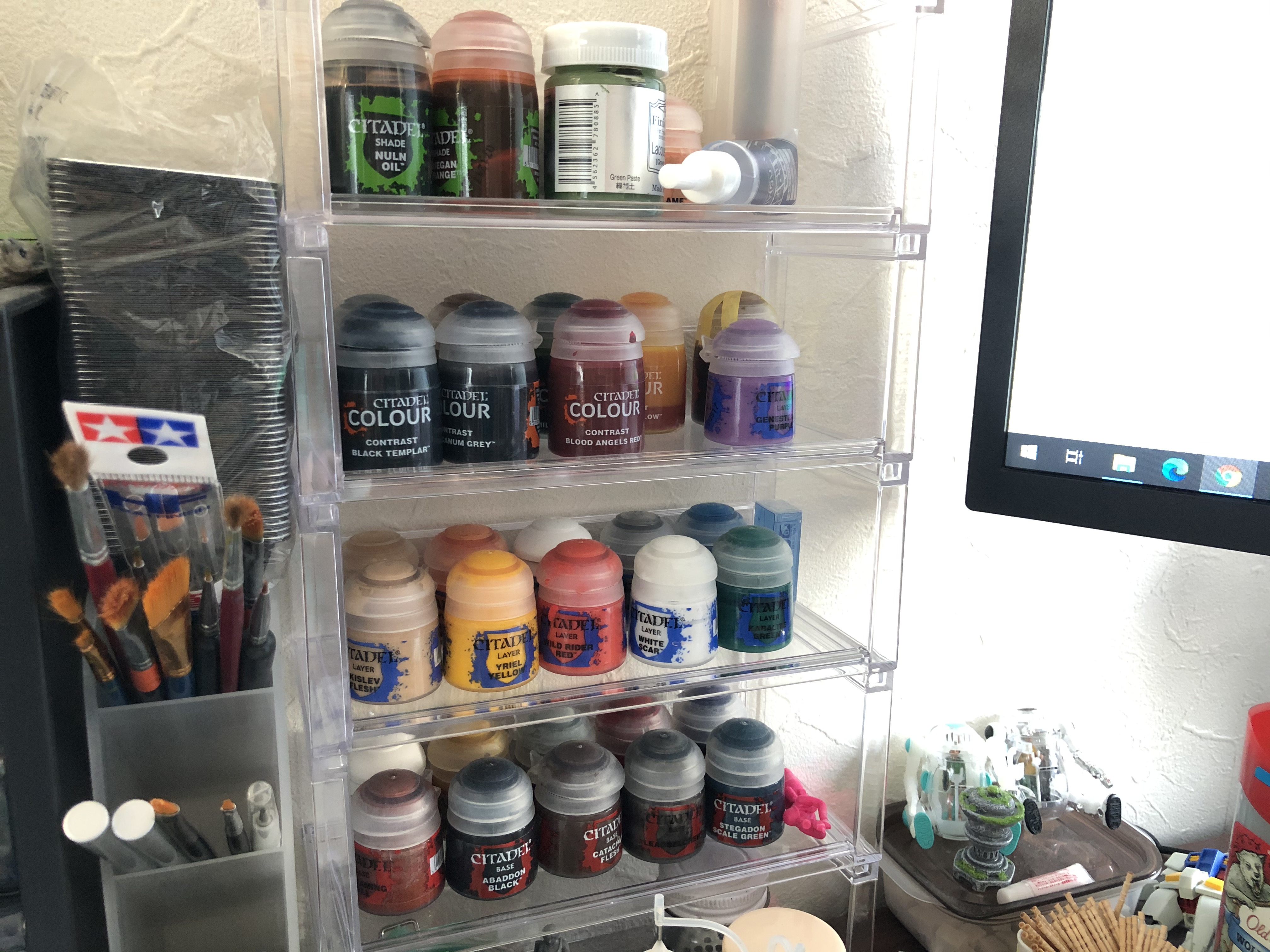 사이즈로는 큰 사이즈에 속하는 가이아노츠의 서페이서는 안들어가지만, 시타델 중 가장 큰 쉐이드, 테크니컬도 딱 사이즈에 맞게 들어갑니다. 그렇다는 것은 타미야 및 군제 도료도 쏙 들어간다는 의미가 되겠지요.
